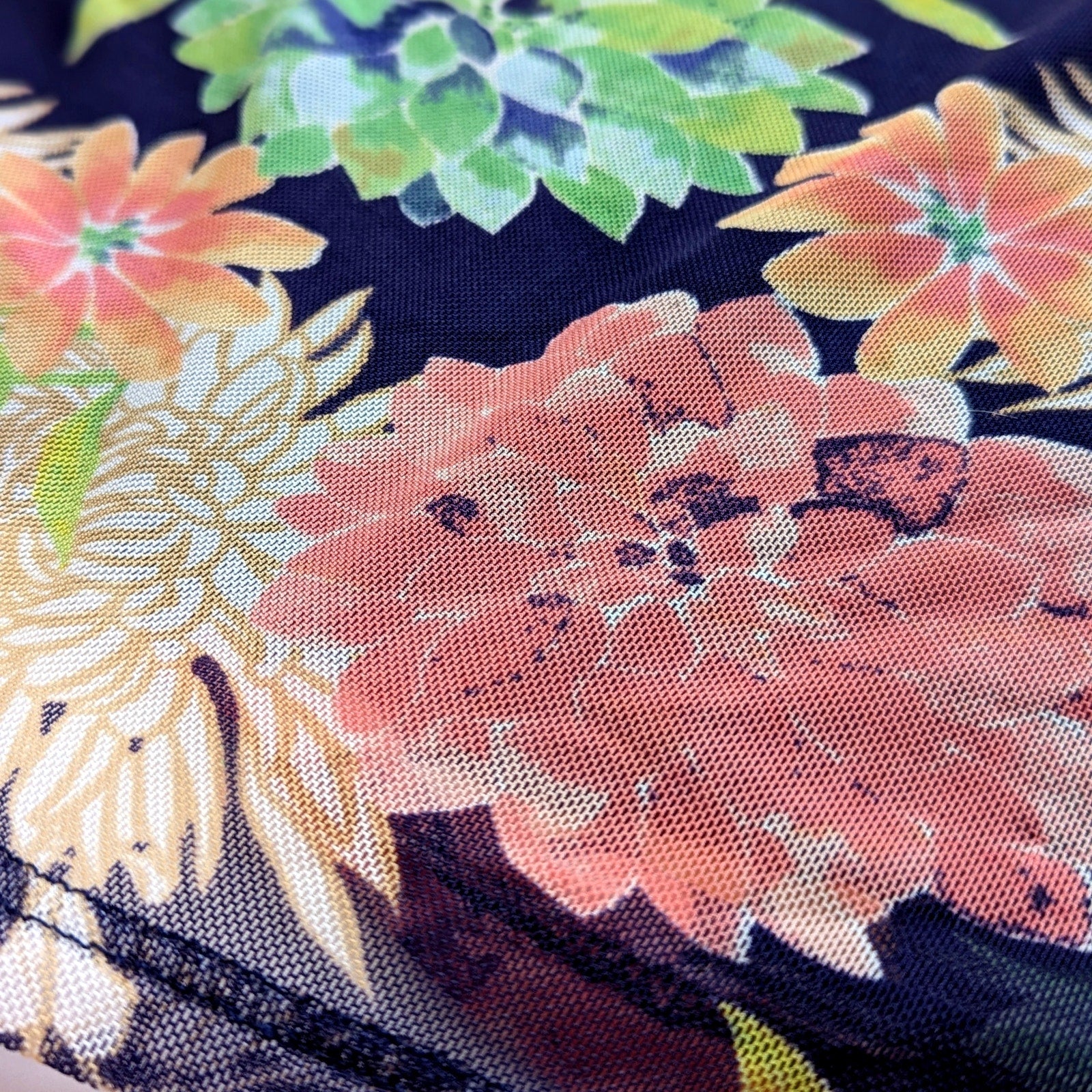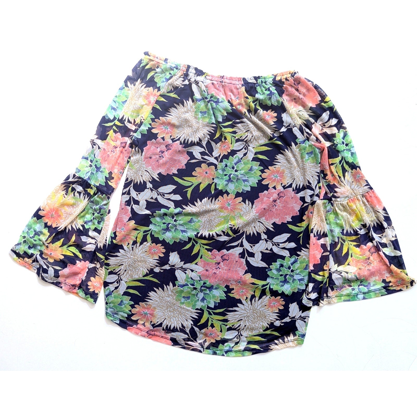 Romantic, breezy, and effortlessly flattering—this Cable & Gauge floral blouse is your go-to for brunch dates, concerts, or just feeling pretty on a weekday. Crafted in a soft nylon/spandex mesh blend, this off-the-shoulder beauty features 3/4 bell sleeves, full lining, and a gorgeous garden print in shades of coral, mint, sage, and lilac over a deep navy background. Stretchy, breathable, and lightweight for warm weather or layering under jackets.
