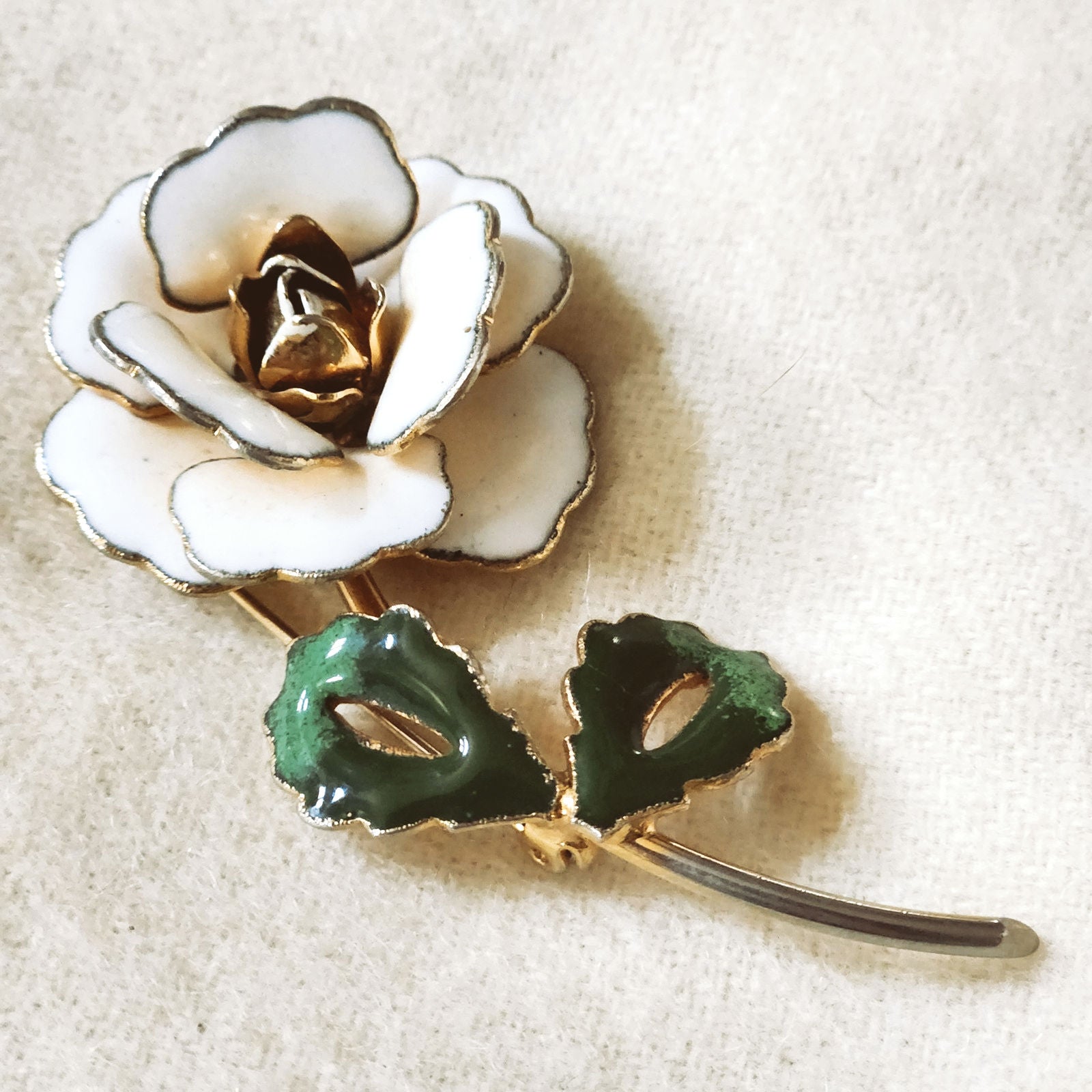 A charming vintage floral jewelry set featuring a sculpted white enamel flower brooch with matching clip-on earrings. Each petal is delicately trimmed in gold tone with soft green enamel leaves and a dimensional, mid-century design reminiscent of gardenias or camellias. The brooch measures approximately 2.5 inches long, and the clip-on earrings are about .75 inch wide.