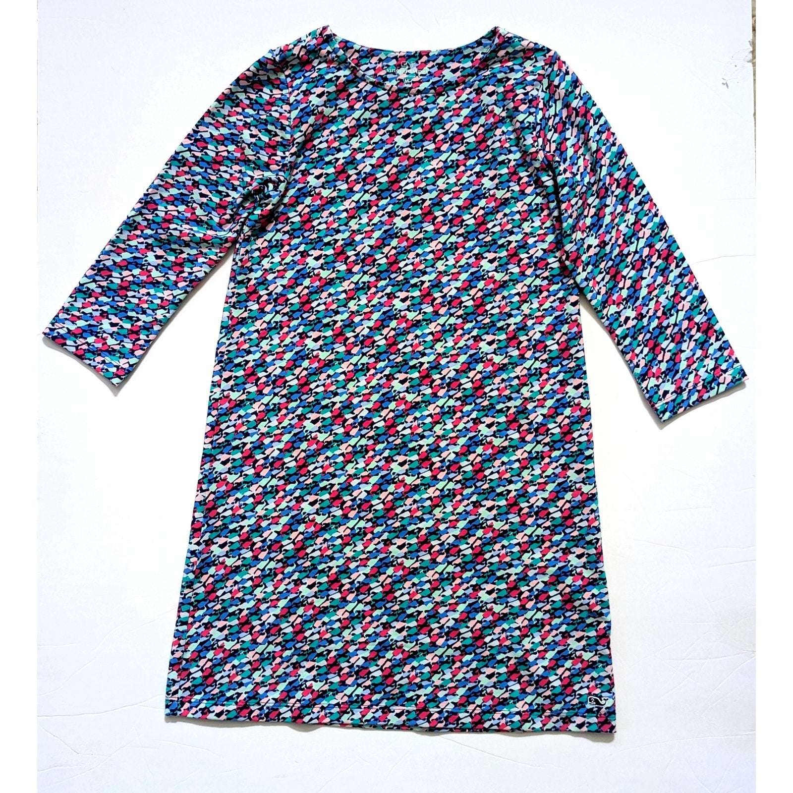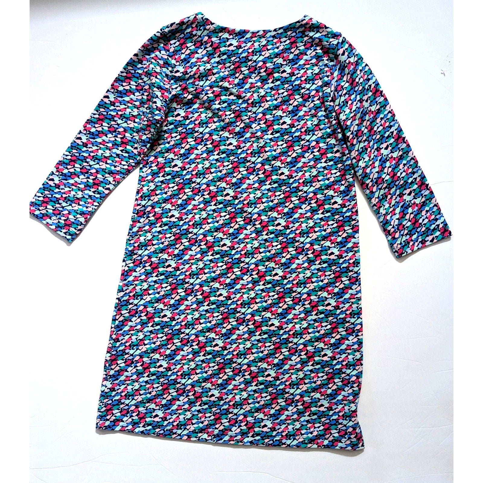 Design: Multicolor whale pattern, shift silhouette, knee-length, 3/4 sleeves
