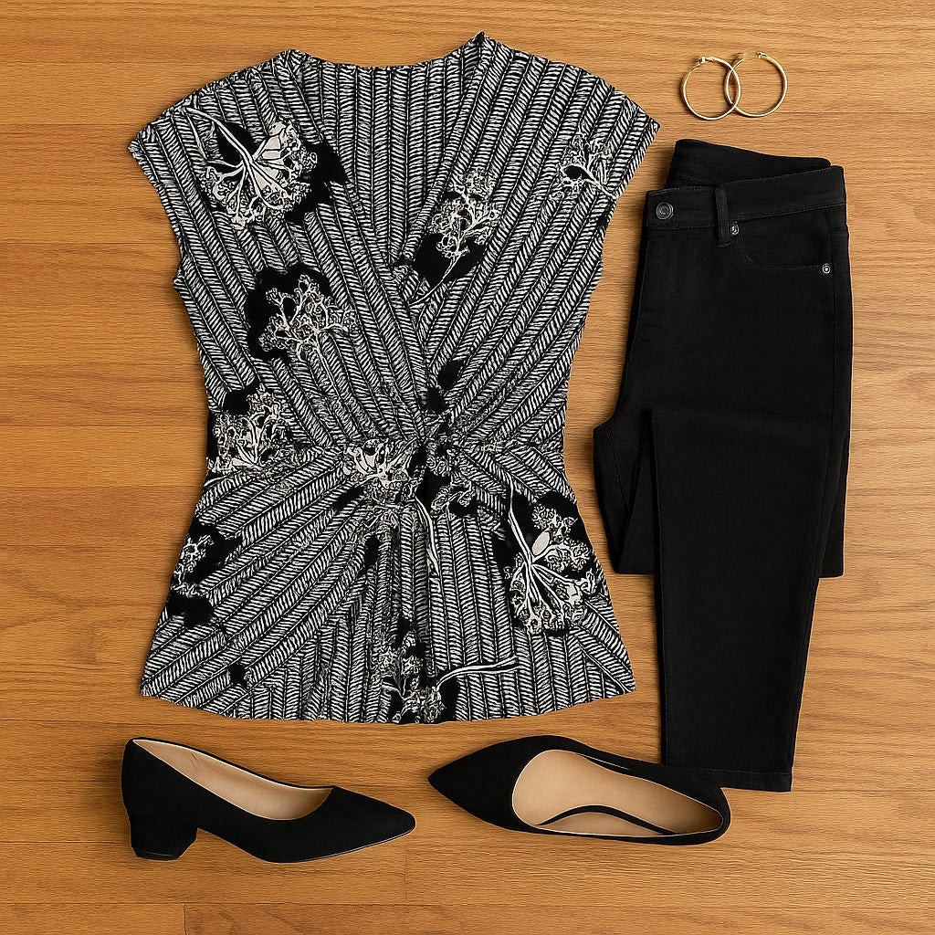 Chic and flattering Deletta for Anthropologie women's Lorine top in black and white floral + chevron print. This stylish faux-wrap blouse features short sleeves, a draped neckline, and a waist-nipping fit that creates a beautiful silhouette. Perfect for both work and casual outings.