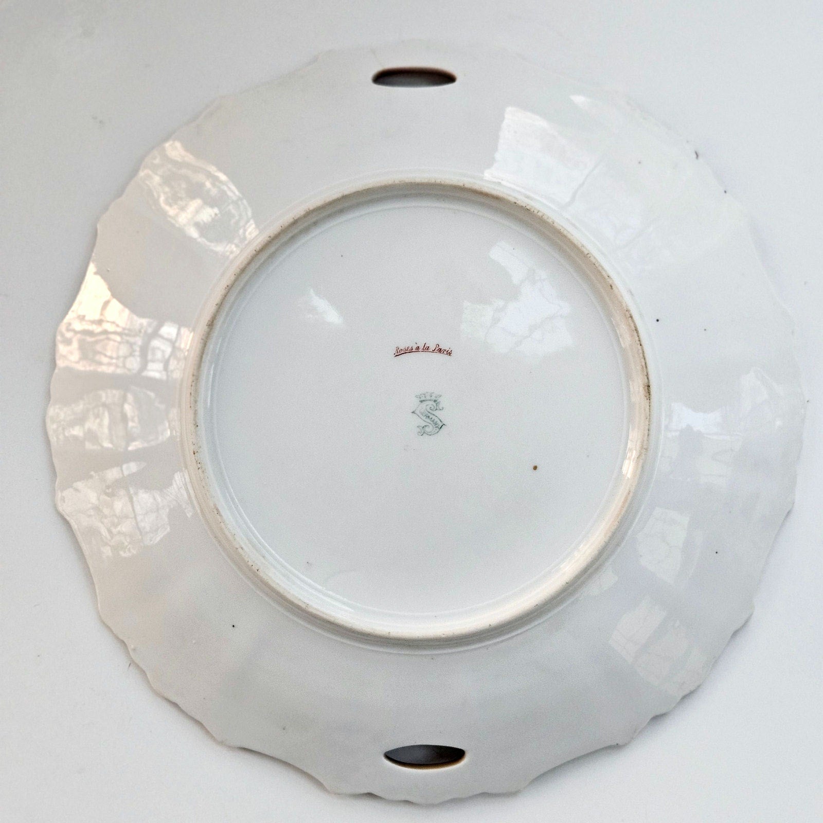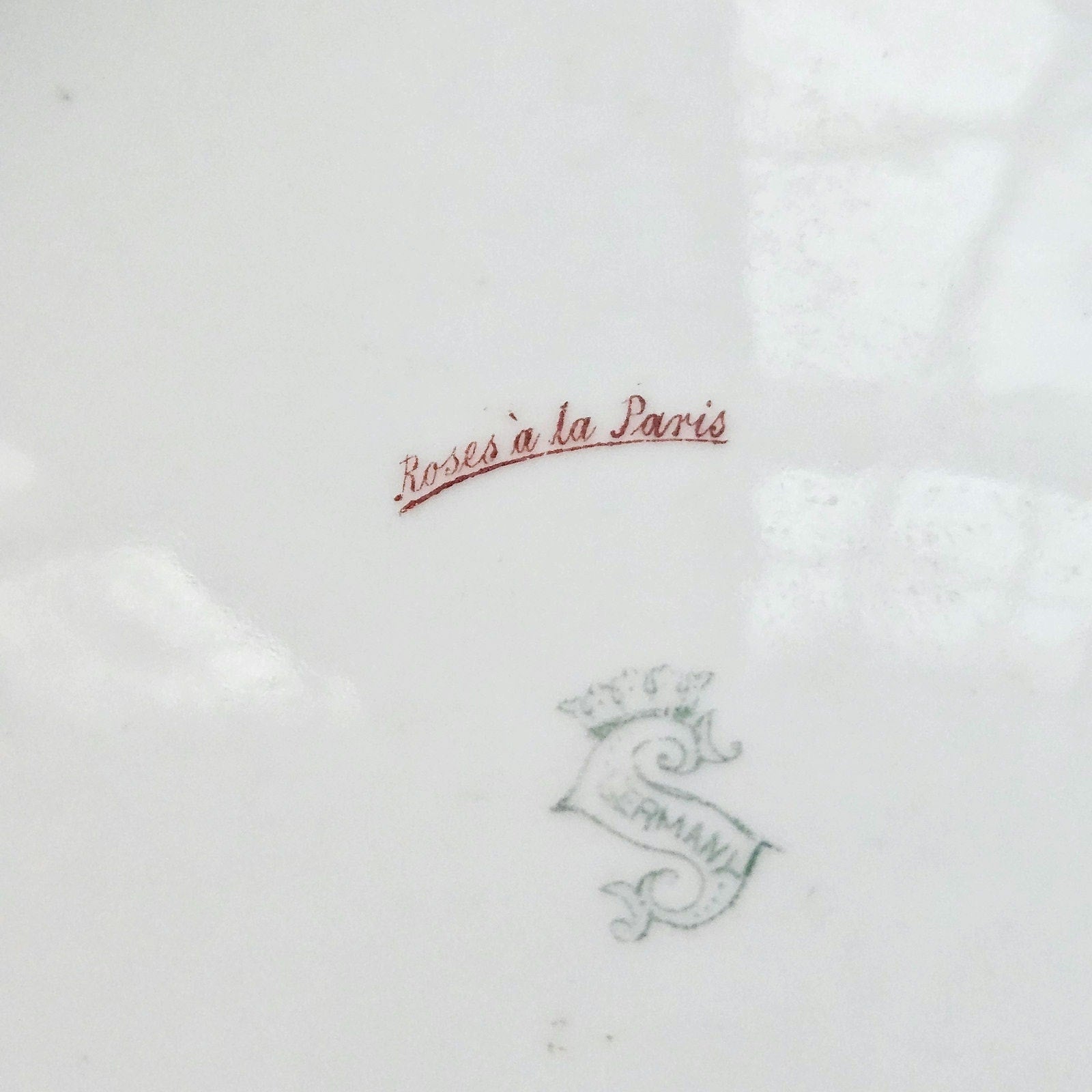 The underside bears the crowned “S” over “Germany” mark associated with Steinmann’s Tiefenfurt factory, along with the decorative script “Roses à la Paris.”