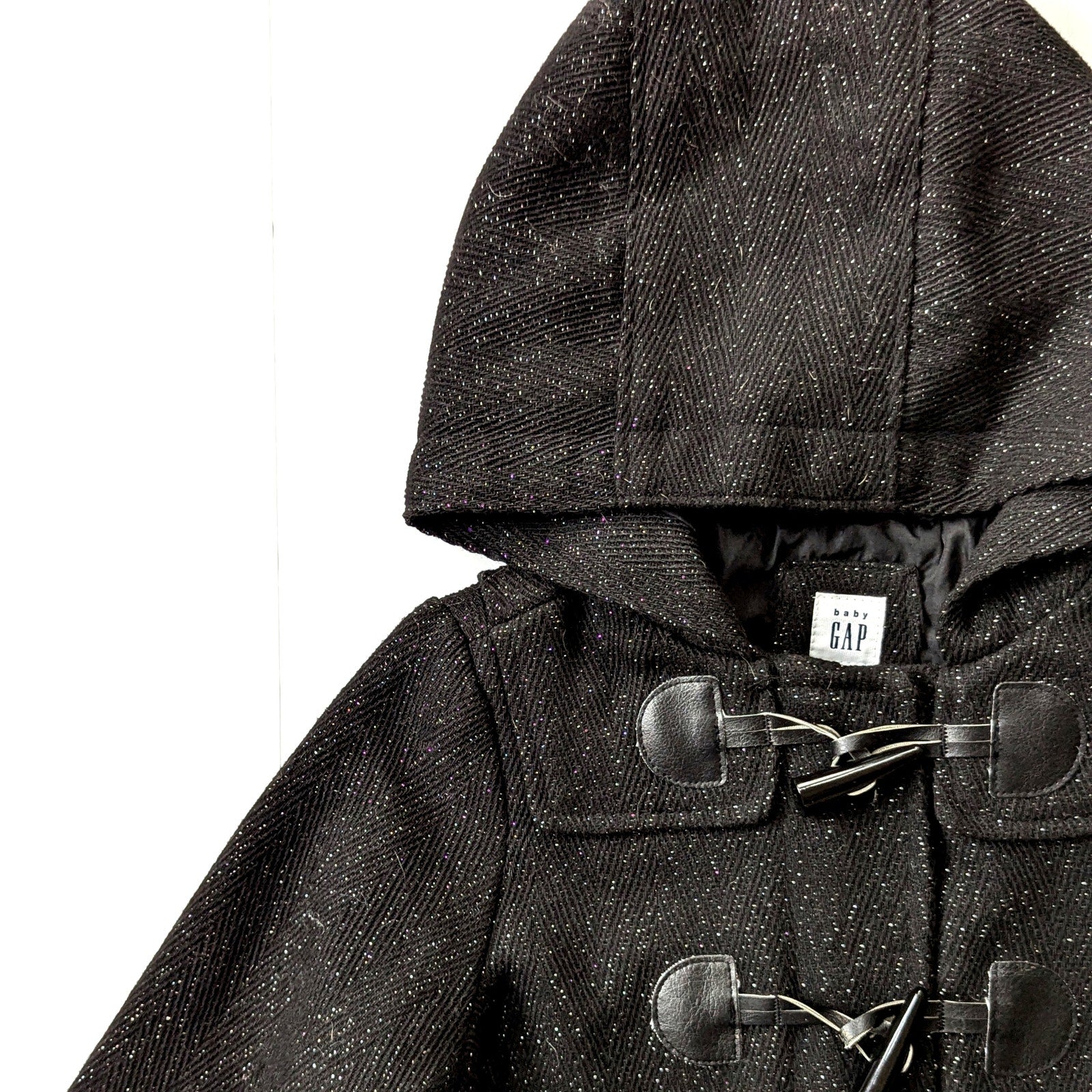Tags: baby gap glitter coat, toddler girl winter jacket, black toggle coat, holiday sparkle kids coat, girls size 4 jacket, Baby Gap toddler outerwear, toddler girl hooded coat, metallic thread coat, winter fashion for kids, girls holiday jacket