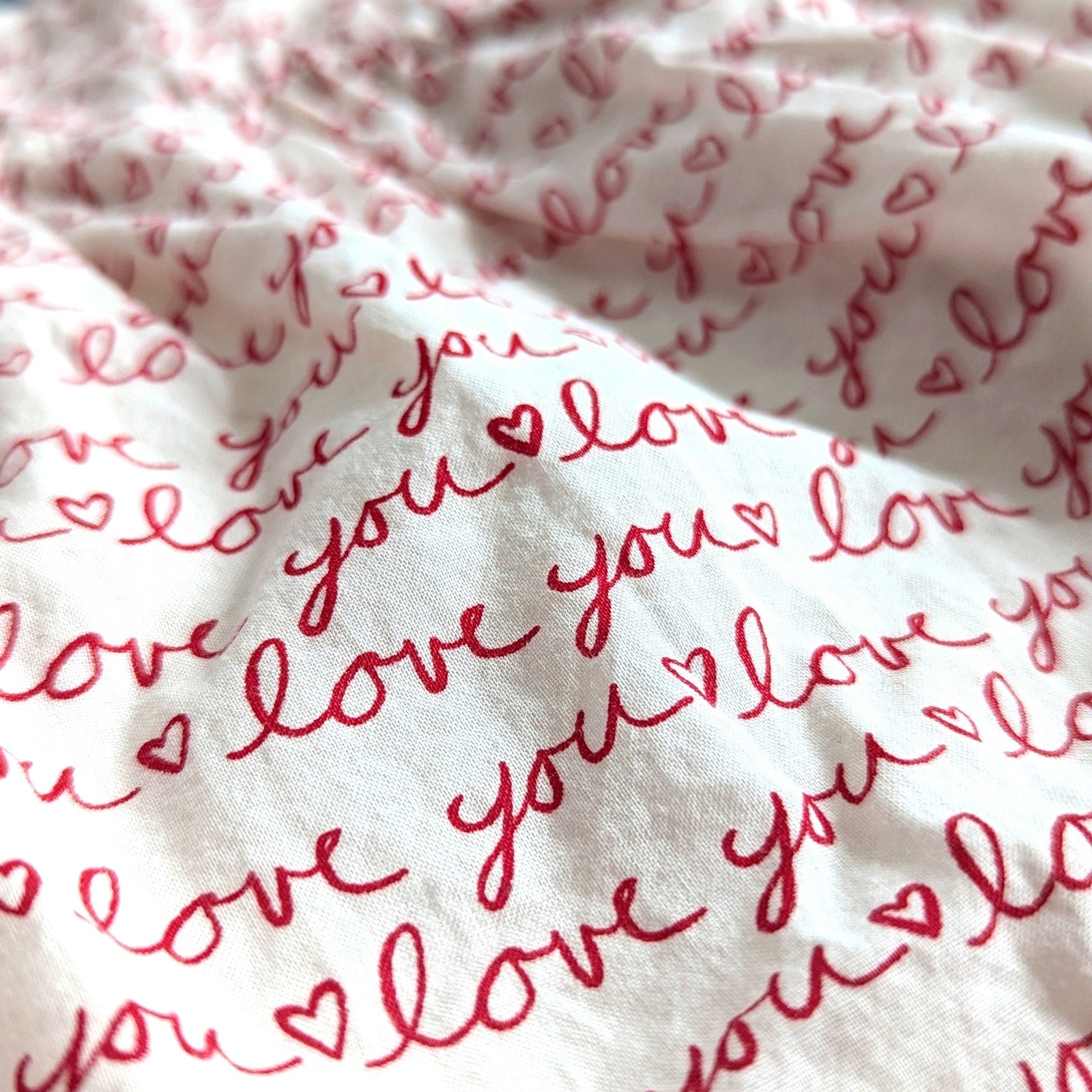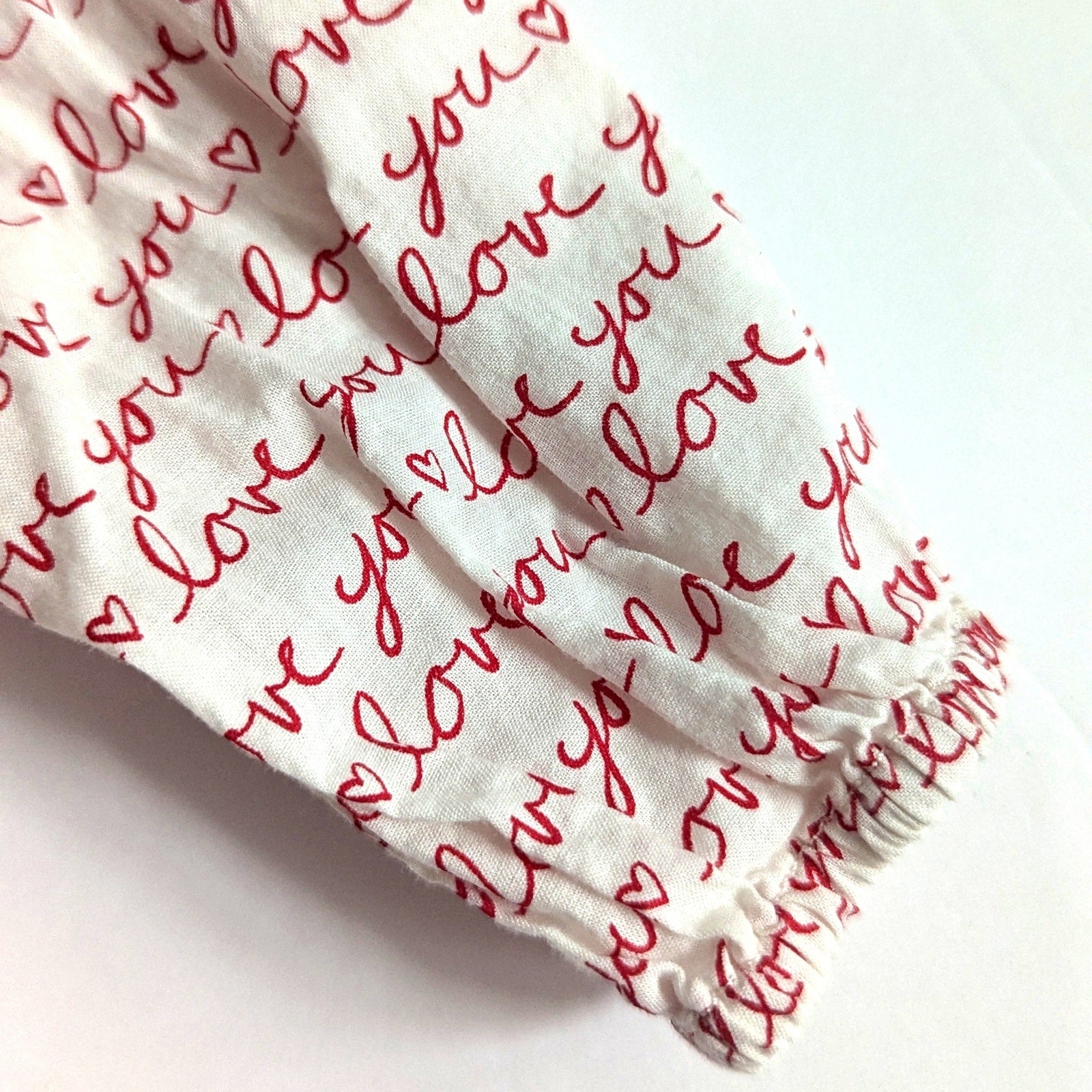 Details: Allover red “love you” cursive print, long sleeves with elastic cuffs, round neckline, and gold heart button placket at the shoulder. Gentle shirring at the front and back yoke adds fullness and charm.