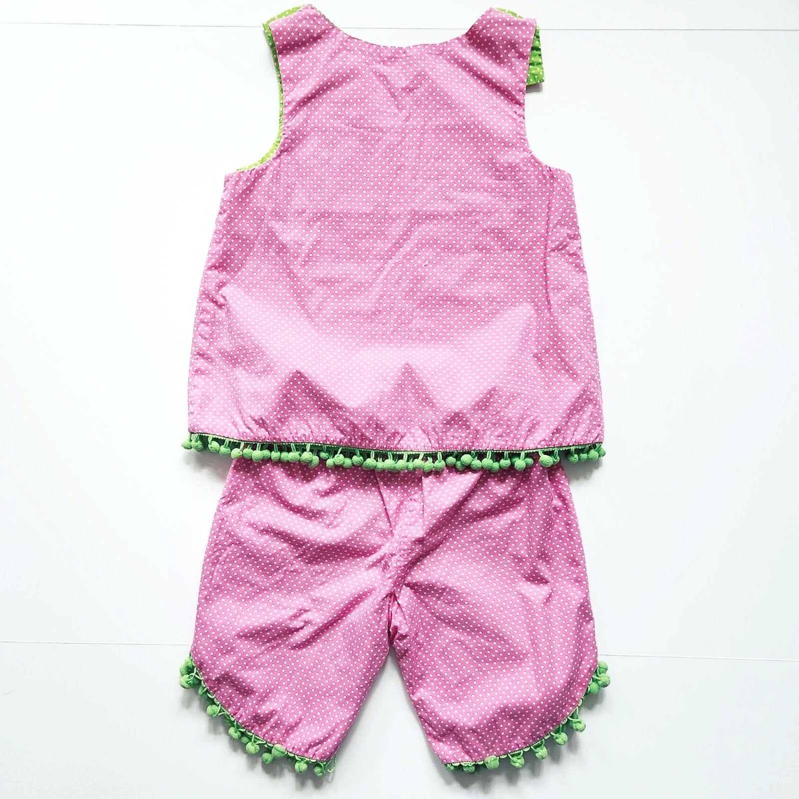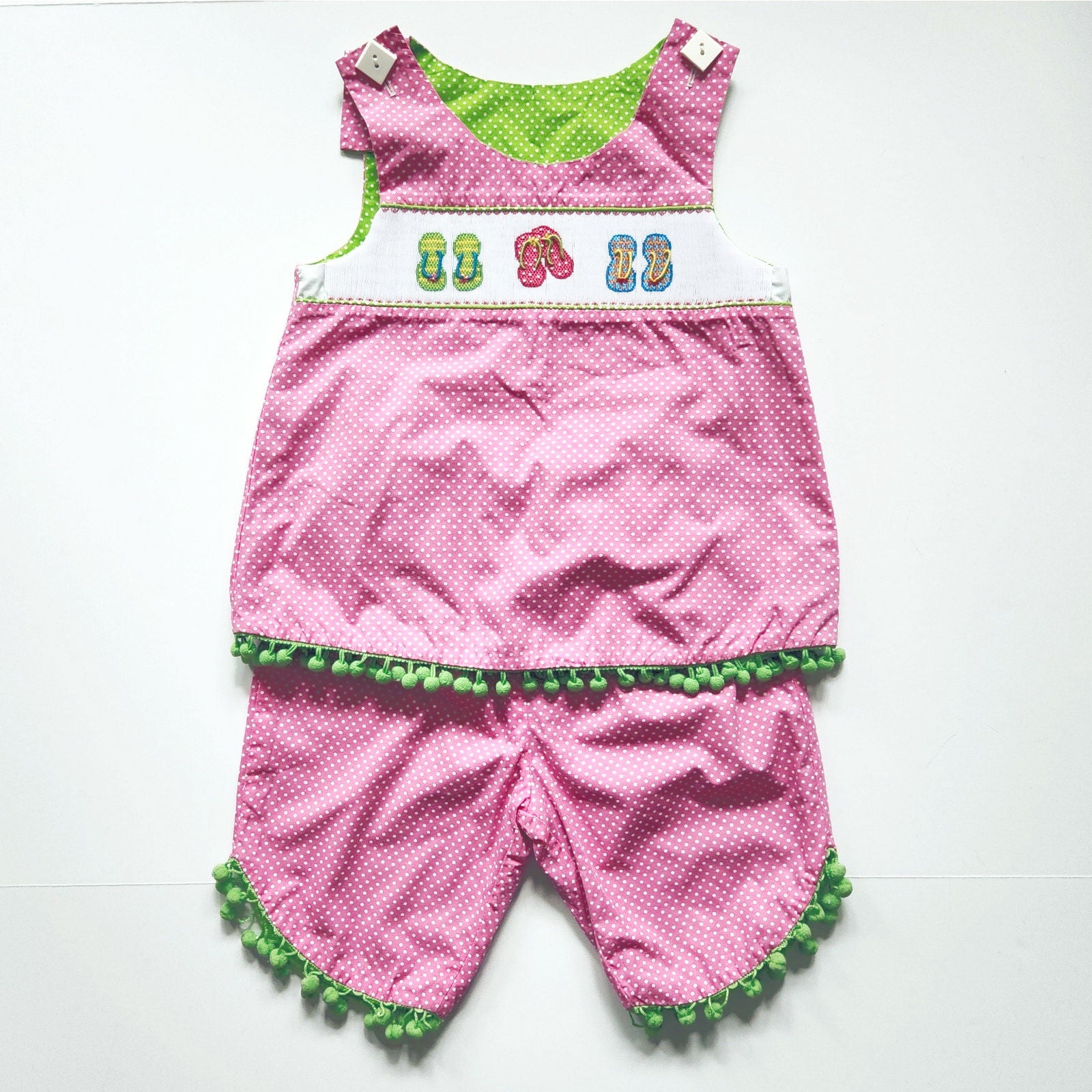 Beaux et Belles Girls 2-Piece Outfit Set | Size 6 | Boutique Smocked Top & Pedal Pushers | Pink Polka Dot with Flip Flop Embroidery