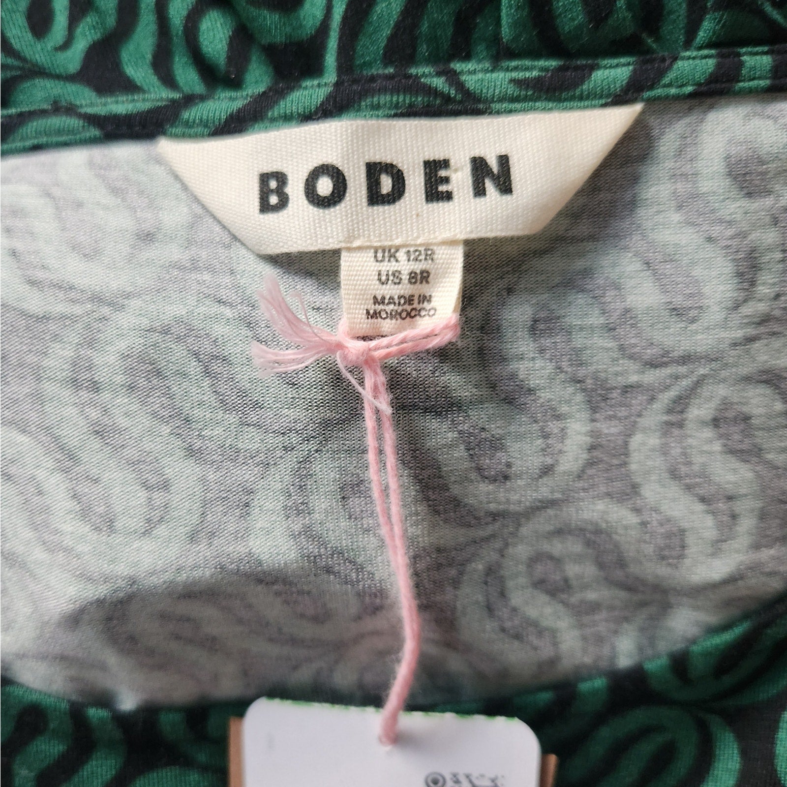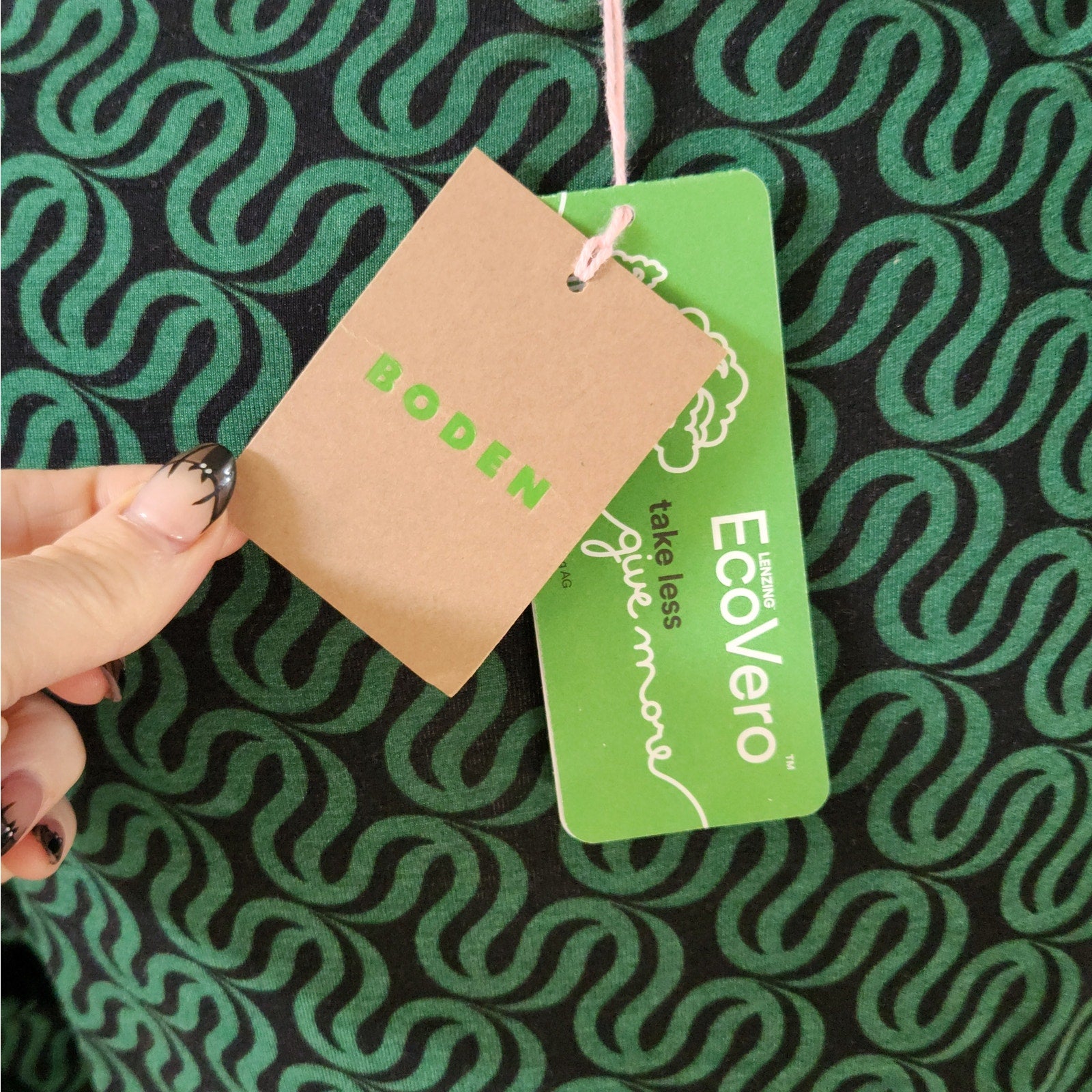 This Boden “Abigail” Long Sleeve Jersey Dress is the perfect blend of comfort and effortless style. Made from soft, stretchy jersey, it offers a flattering fit that moves with you. Crafted from soft, stretchy Lenzing Ecovero jersey fabric, it flatters the figure with a gently fitted bodice, ruched waistband, and a flowing A-line skirt that moves beautifully with you. The bold green geometric print adds a pop of modern sophistication to a classic silhouette. The long sleeves and feminine silhouette make it ideal for year-round wear — dress it up with heels or down with flats and a denim jacket. Perfect for the office, dinner dates, or weekend outings — pair it with ankle boots or heels for a polished, effortless look.