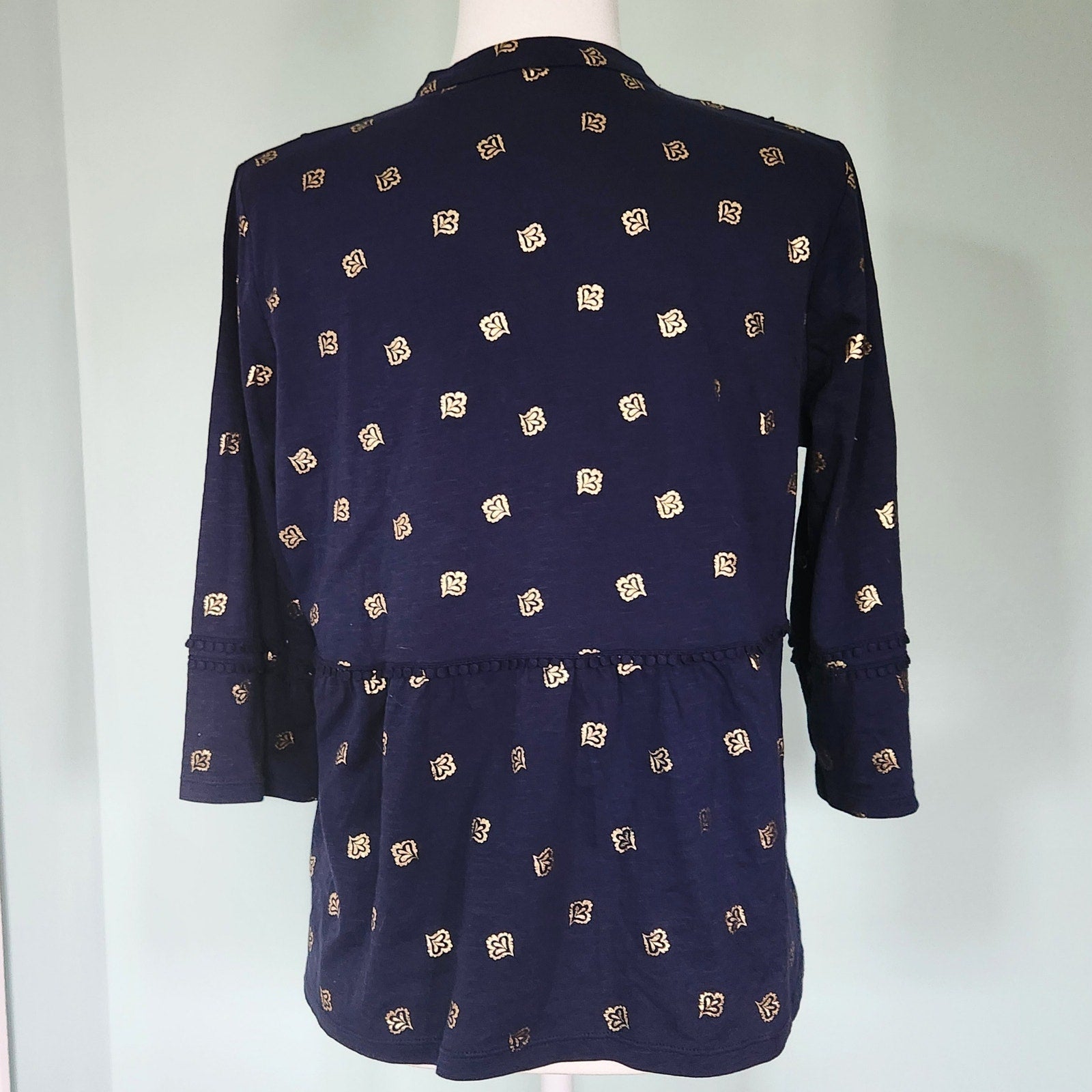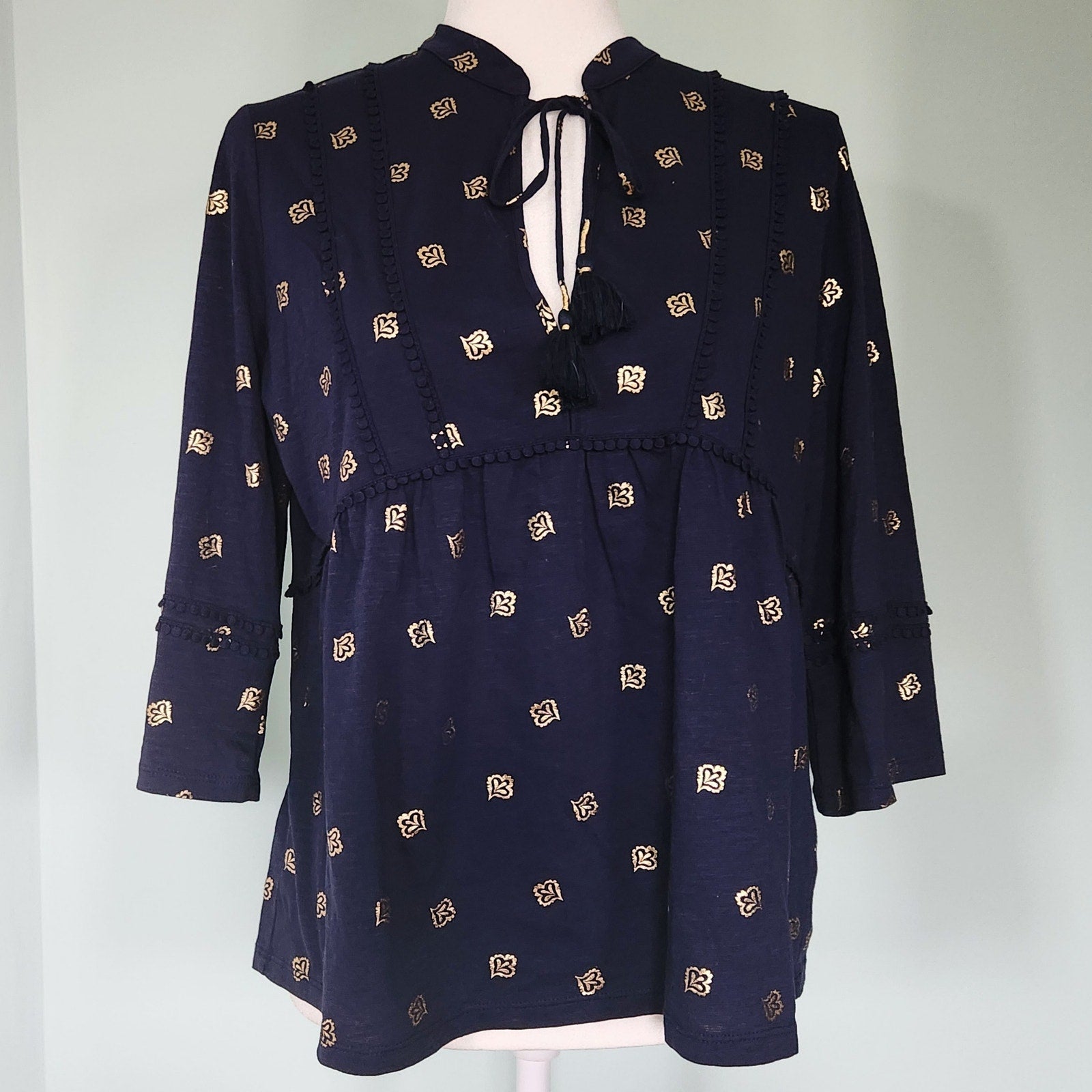 Boden Boho Women's Tassel Tie Blouse Navy Gold Print 100% Cotton Petite 10P Bohemian Top
