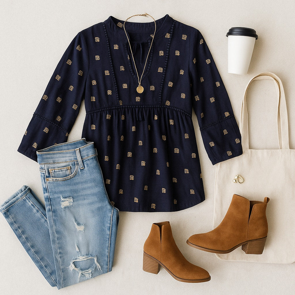 Chic and versatile Boden Tassel Tie Boho Blouse in navy with metallic gold accents. Effortlessly stylish with a flattering bohemian vibe, this blouse is perfect for pairing with jeans, skirts, or shorts for travel, work, or casual wear.