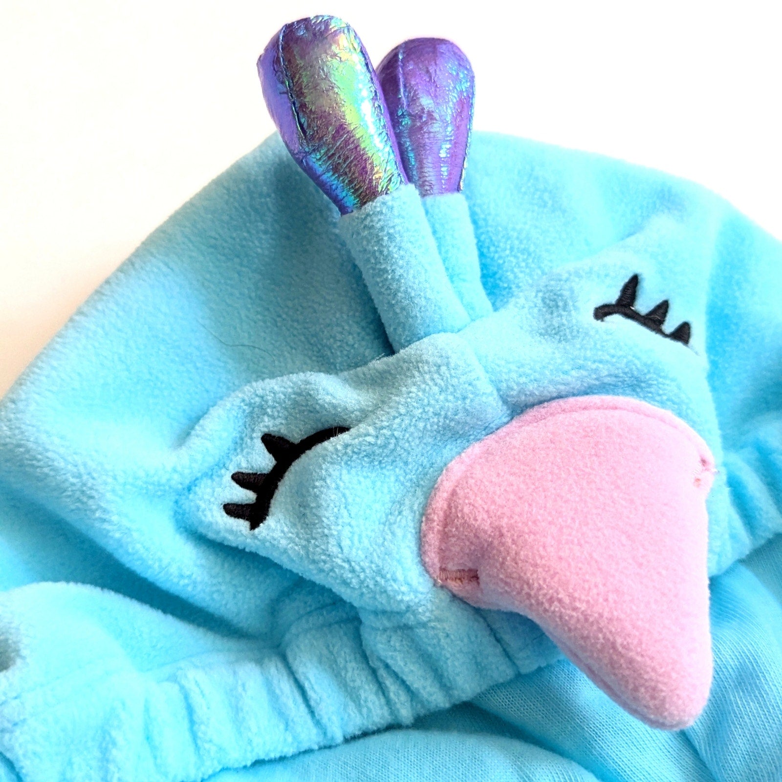 Adorable Carter’s infant Halloween bubble costume featuring a colorful peacock/peachick design in turquoise, pink, and purple. Made from soft polyester fleece with jersey lining for baby’s comfort. Easy zip front with hood featuring embroidered eyes, plush beak, and iridescent feather tufts. Perfect for Halloween, themed parties, or photo shoots!