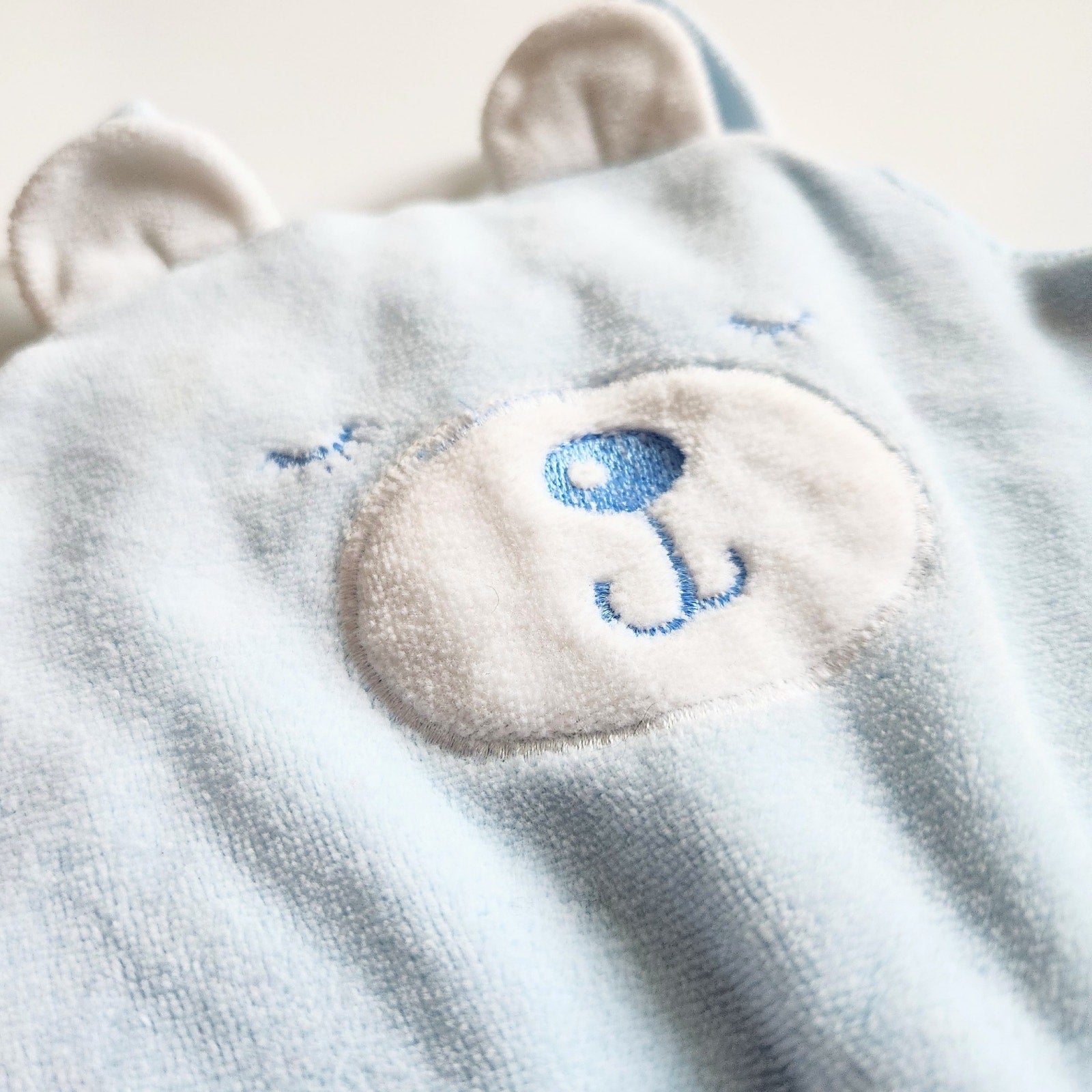 This sweet vintage-style baby blue velour romper is as soft and cuddly as it looks! It features an adorable embroidered bear face with sleepy eyes on the chest and tiny bear ear straps, making it the perfect cozy outfit for little ones. The soft, cozy fabric ensures warmth and comfort, while the snap closure at the legs makes for easy changing.