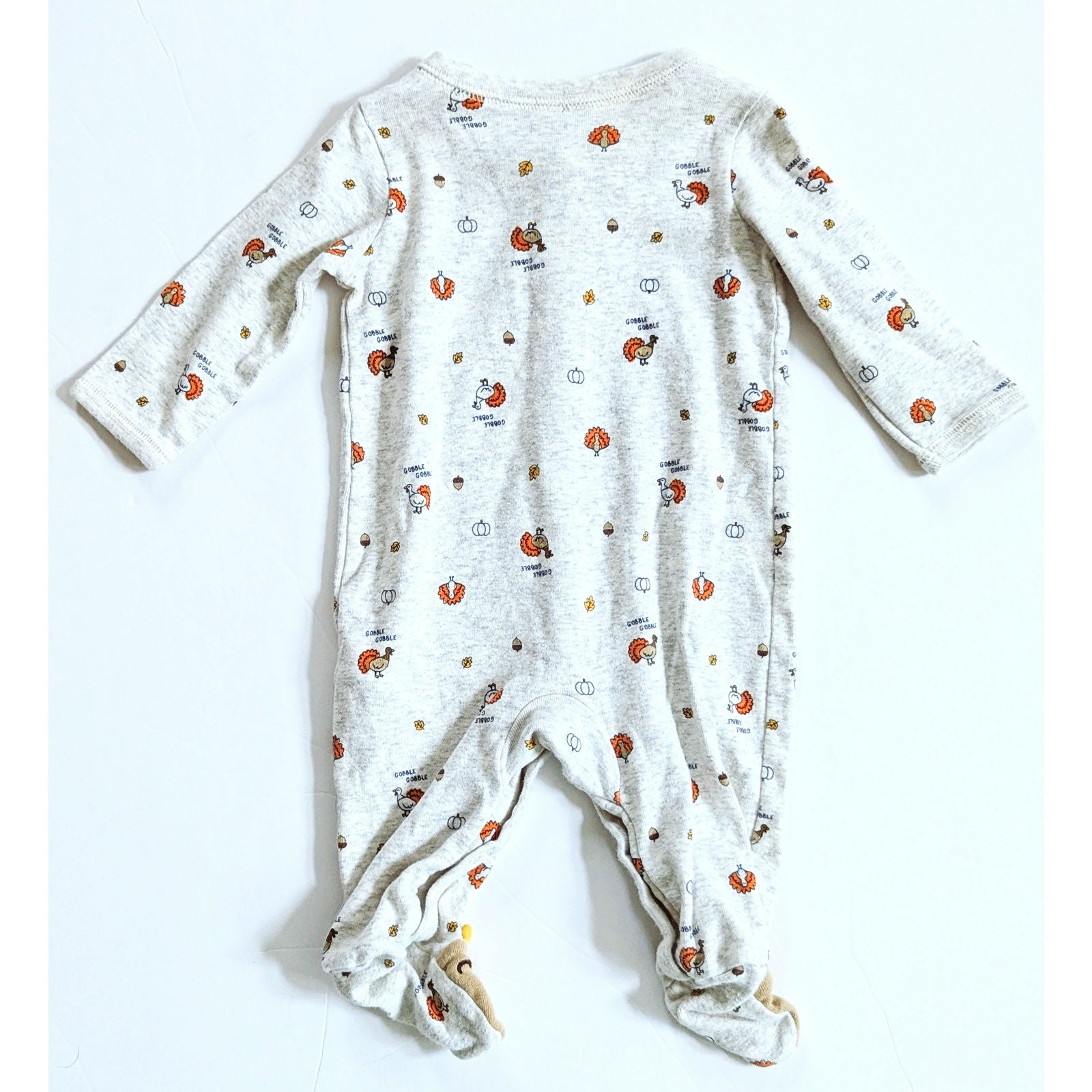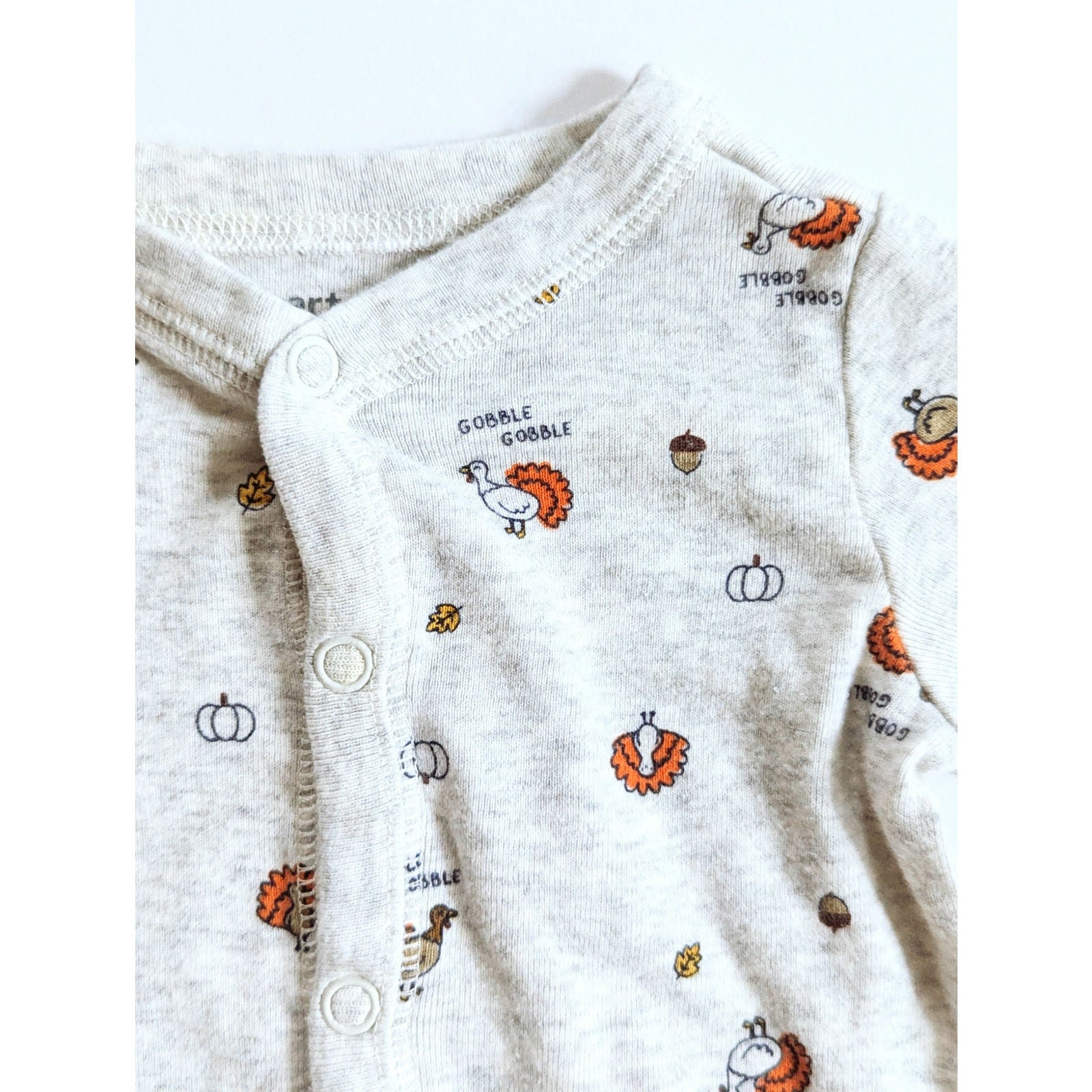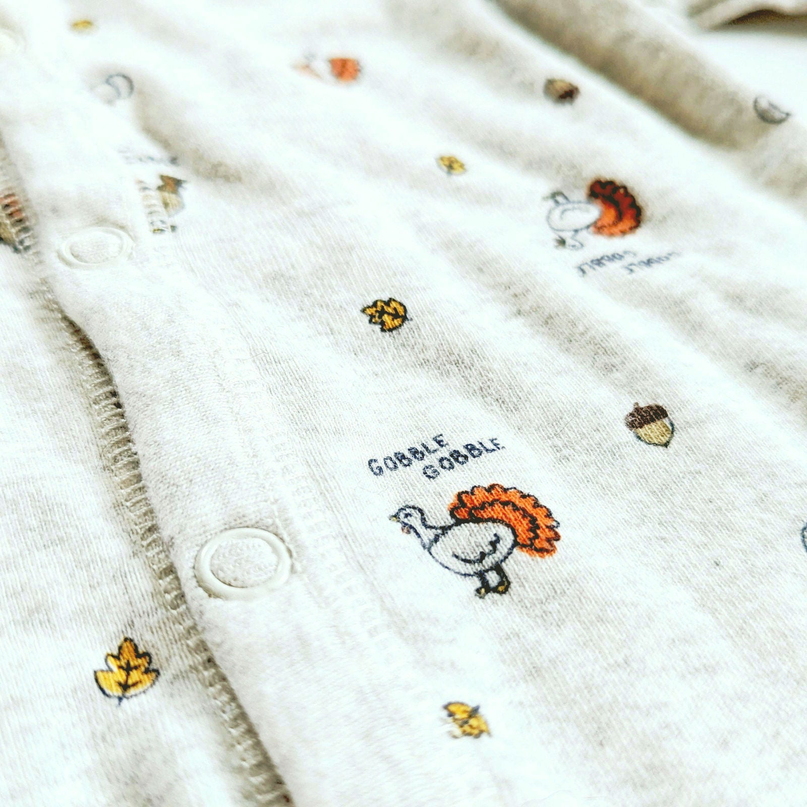 thanksgiving baby outfit, turkey footie, carter’s baby sleepwear, baby’s first thanksgiving, gender neutral baby clothes, baby holiday pajamas, baby gobble gobble romper, baby thanksgiving pajamas, carter’s fall baby, festive baby sleeper, cozy baby footie