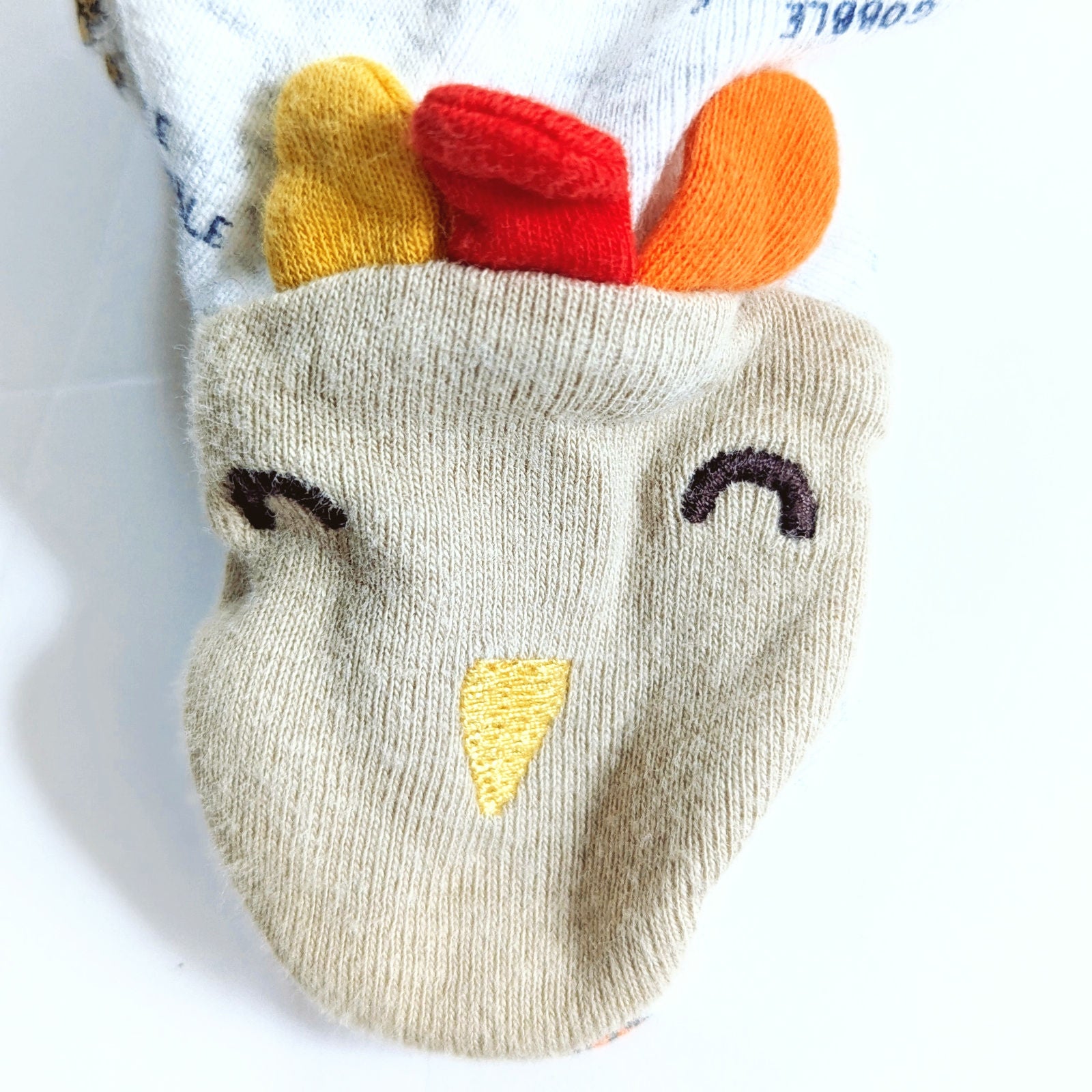 👣 Built-in 3D turkey face footies with colorful appliqué feathers