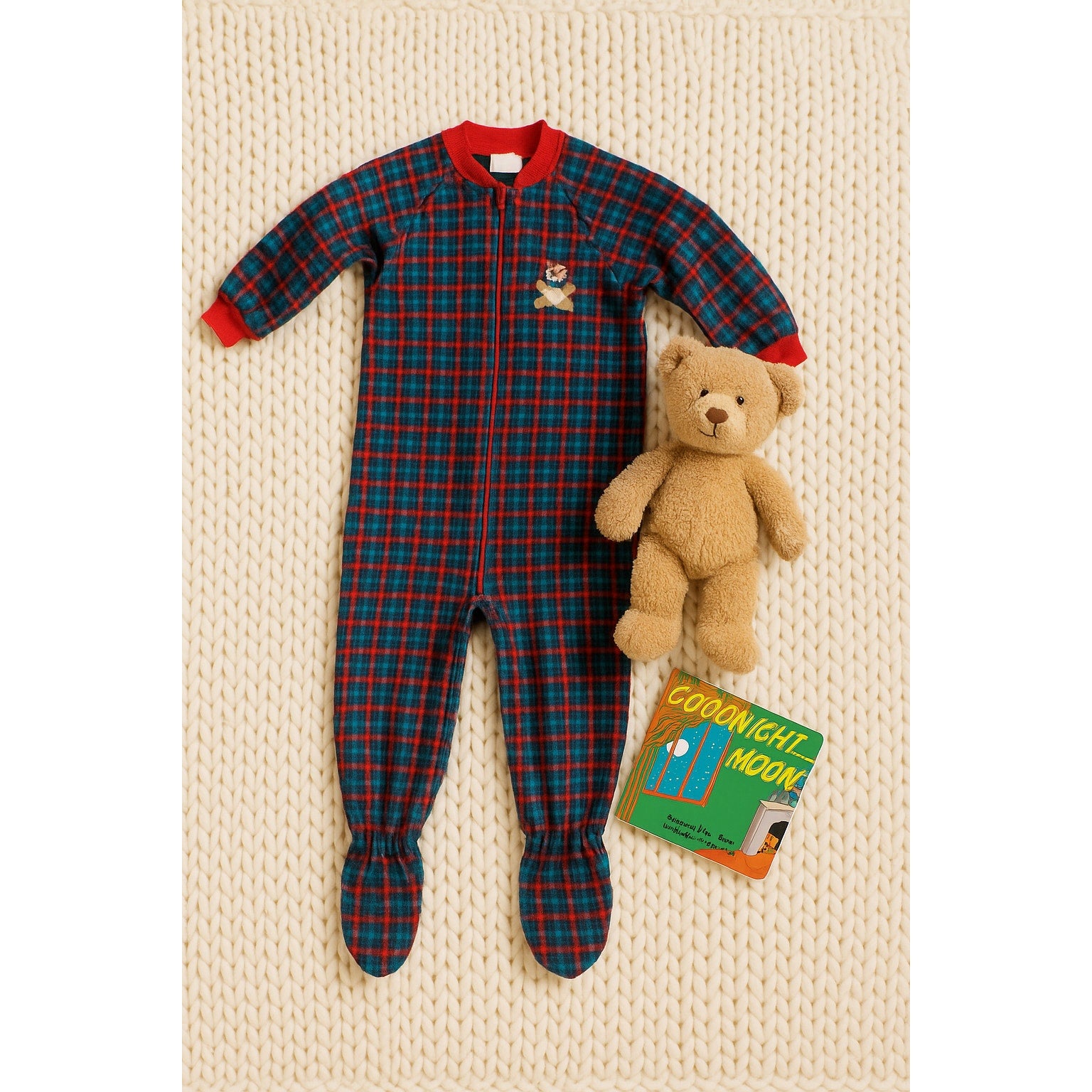 Step back into cozy 90s childhood nights with these adorable vintage Carter’s fleece footie pajamas. Featuring a bold red and blue plaid print with an embroidered teddy bear detail on the chest, this one-piece pajama is perfect for retro lovers, collectors, or parents who adore vintage kids’ fashion.