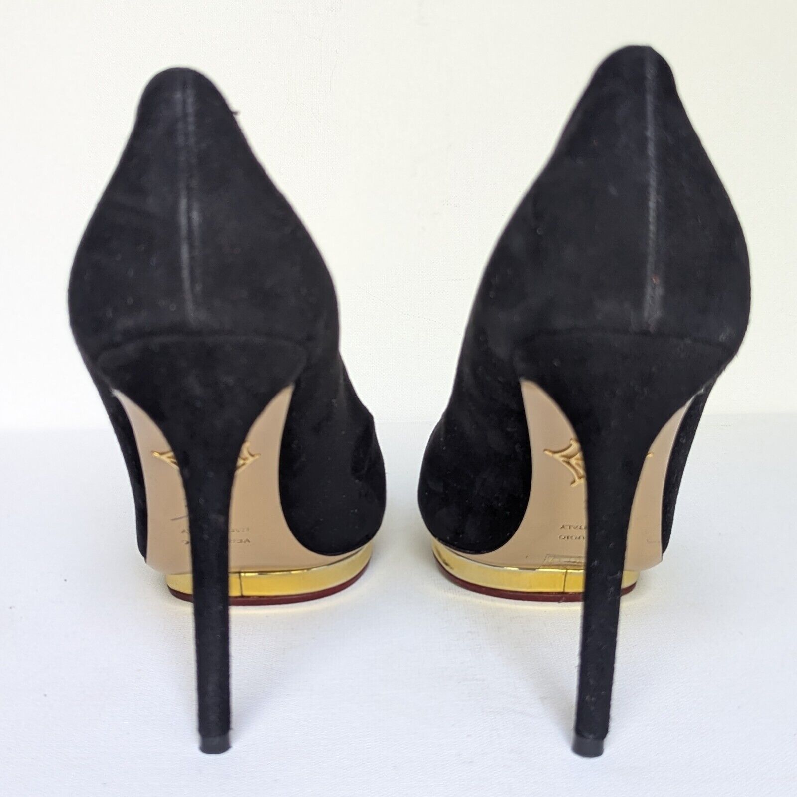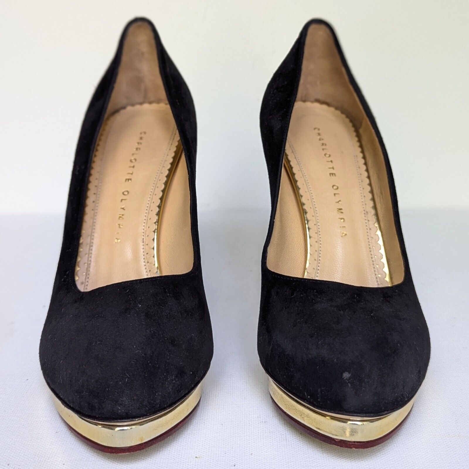 Charlotte Olympia Black Suede & Gold Debbie Pumps Size 39 | 8.5 Made in Italy
