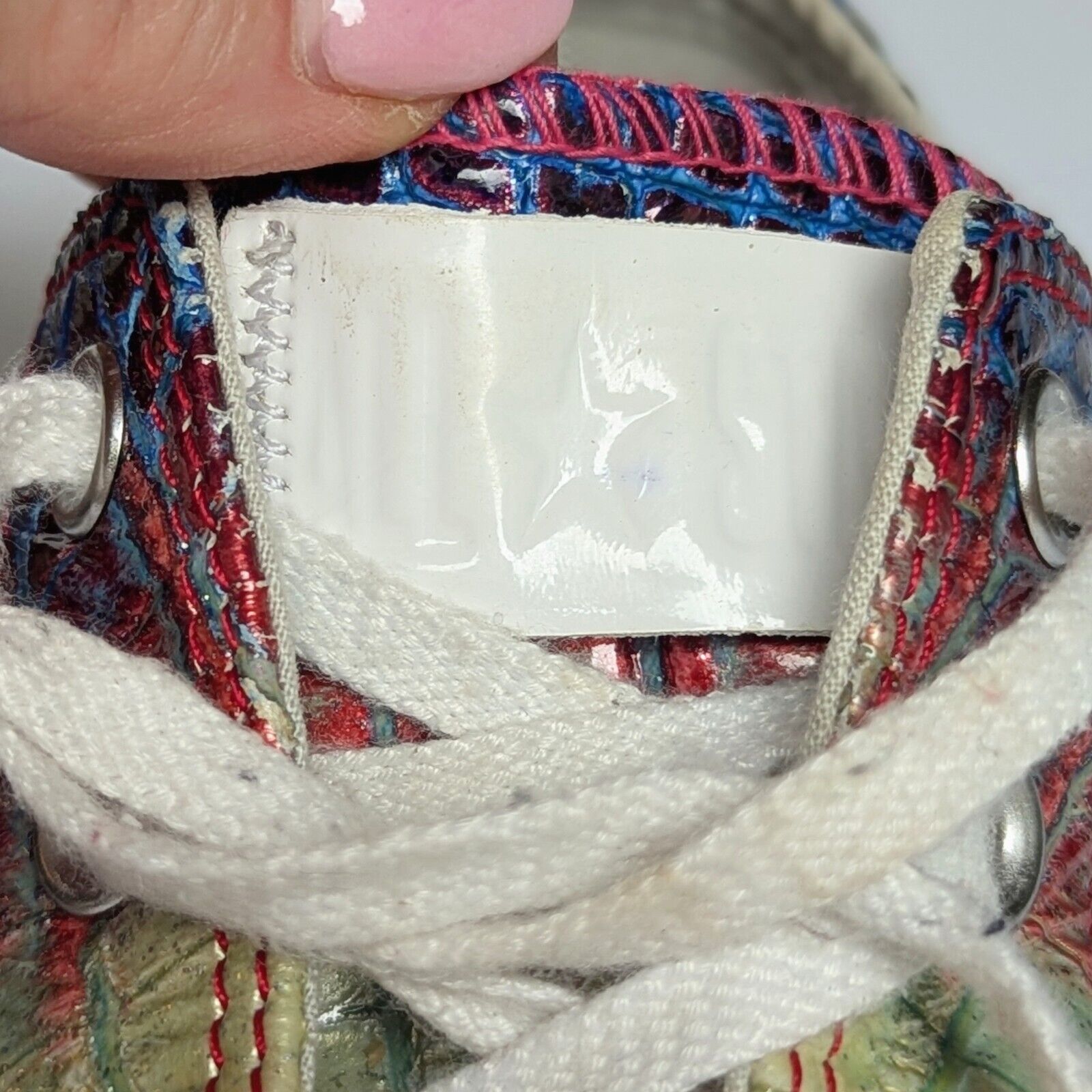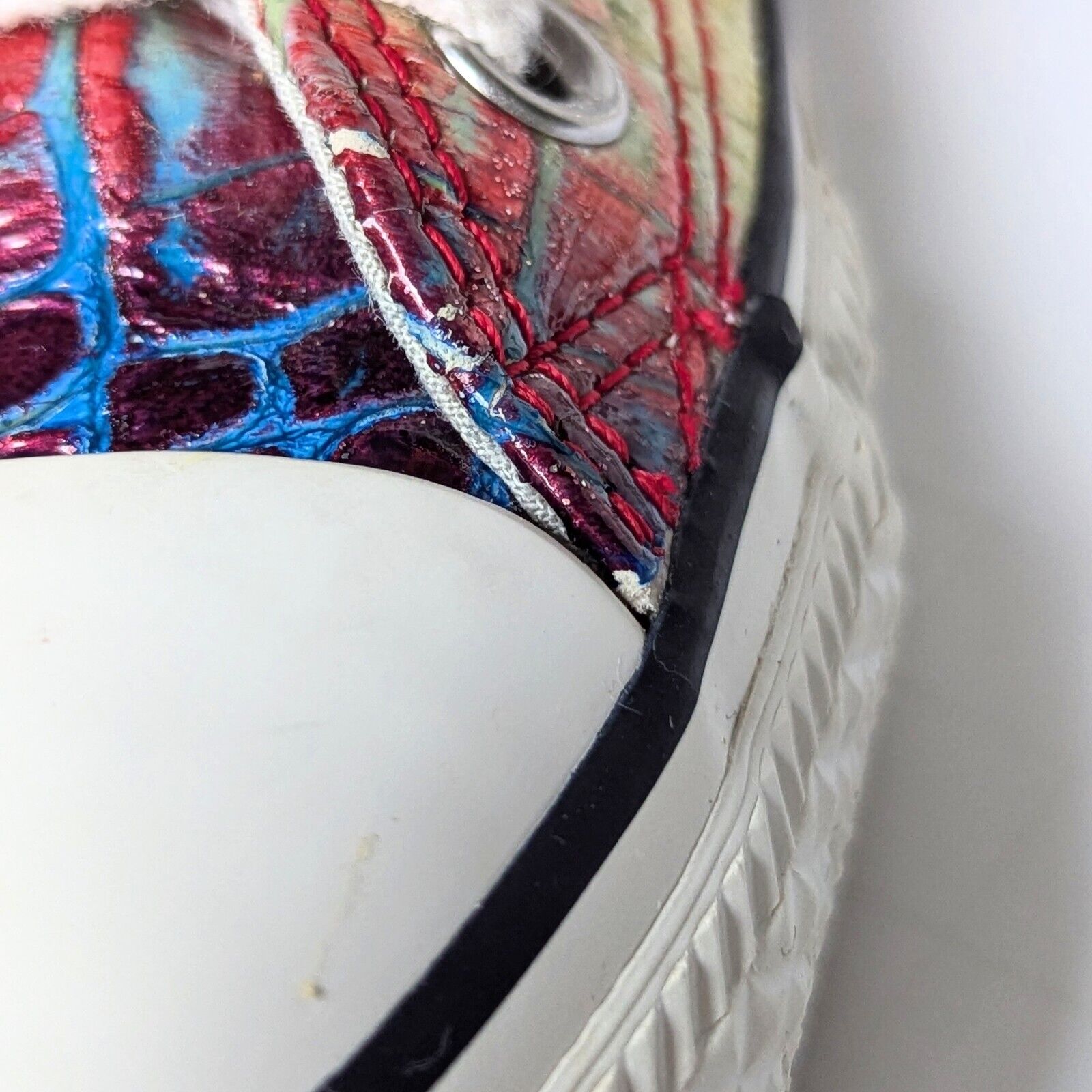Stand out with these Limited Edition Converse Chuck Taylor All Stars featuring a bold metallic crocodile skin texture in iridescent shades of blue, red, and gold. A rare collector’s piece, these sneakers merge classic Converse design with a high-fashion edge.
