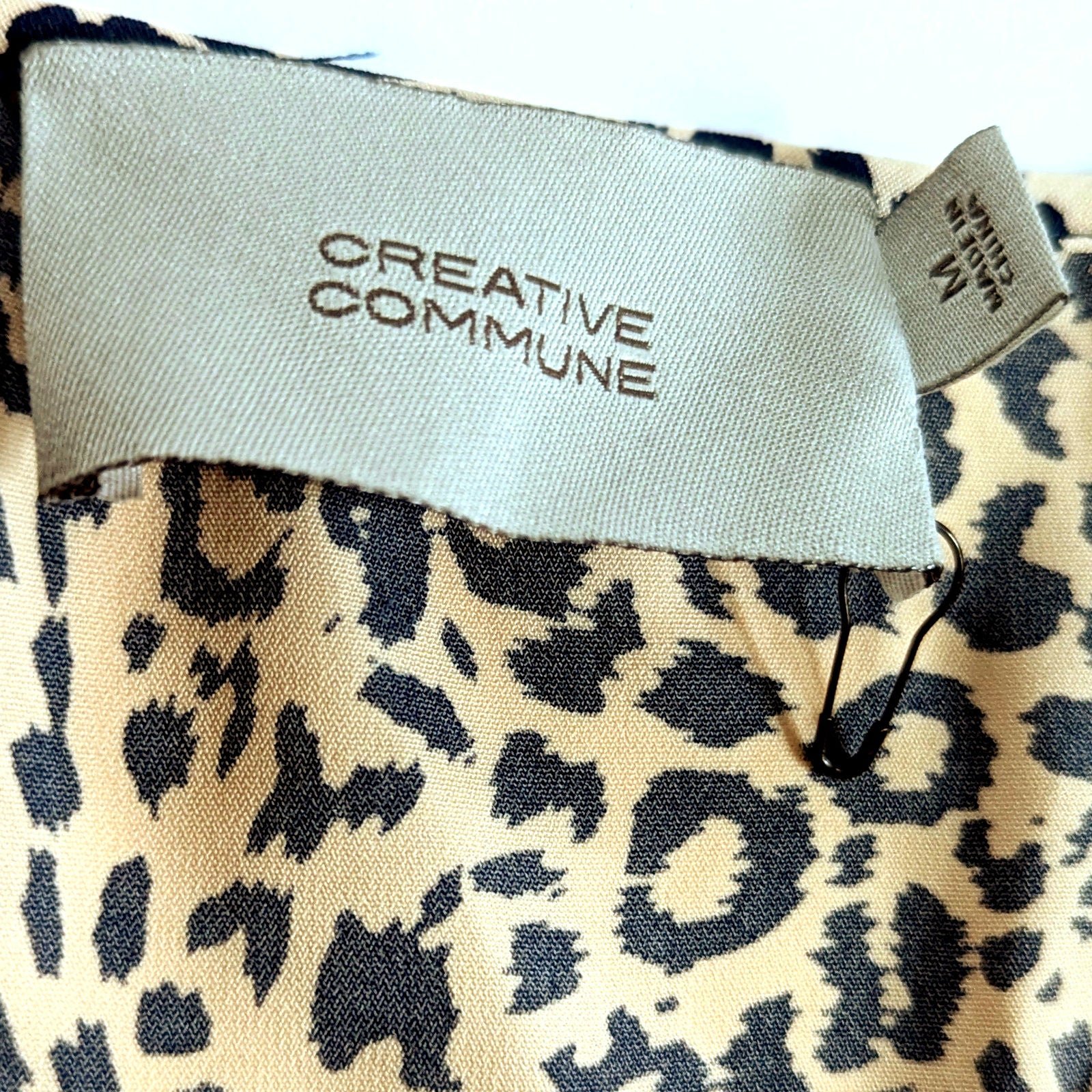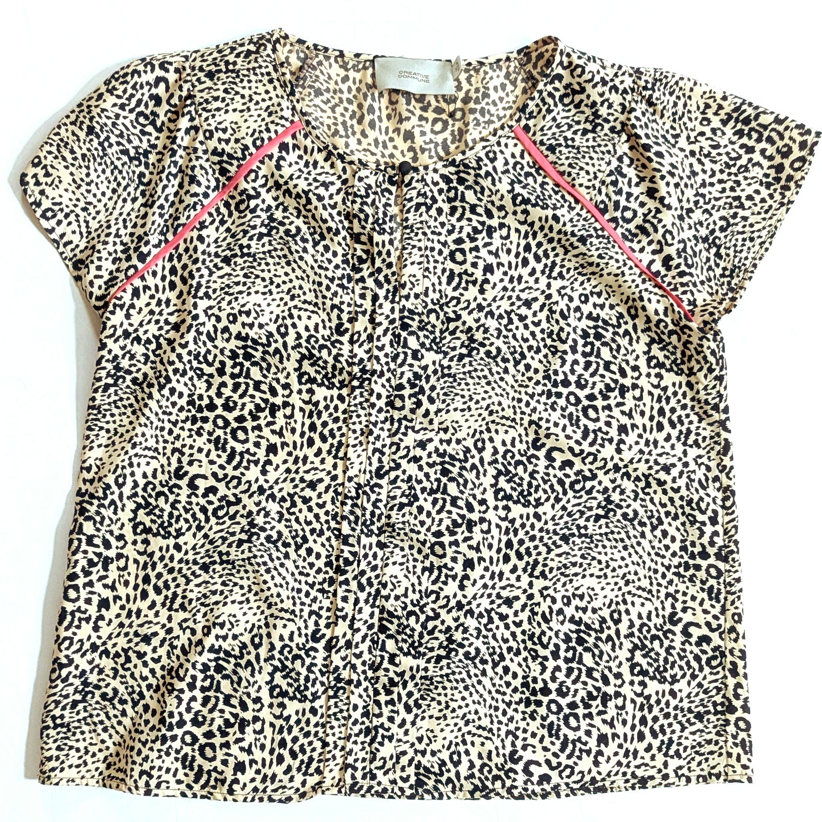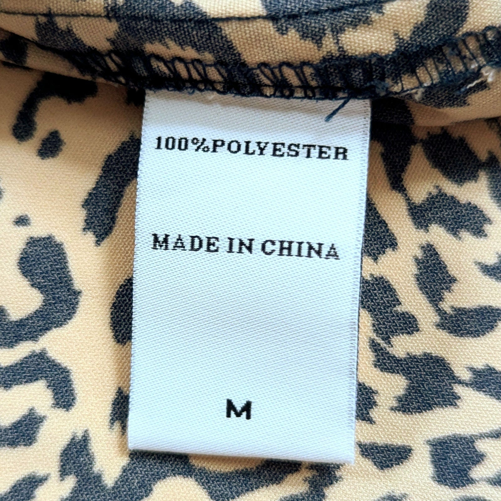 creative commune blouse • leopard print top • animal print blouse • women’s size medium • pink trim top • short sleeve blouse • neutral animal print • lightweight polyester blouse • workwear chic • trendy leopard print shirt • office casual top • classy animal print blouse • modern feminine blouse