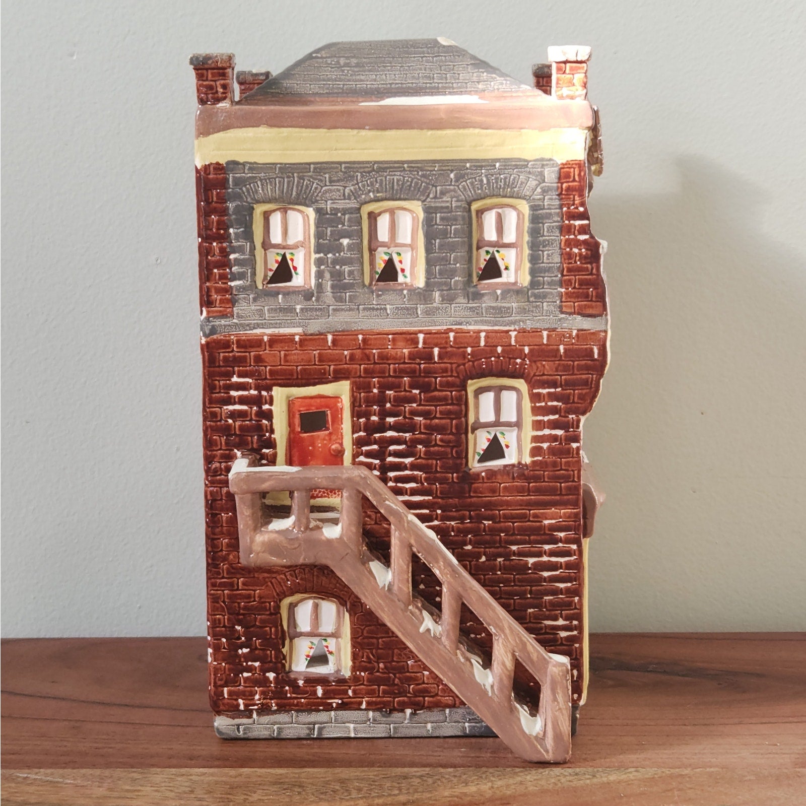 Bring nostalgic small-town charm to your holiday village! This 1984 Snow Village grocery store features brickwork detail, side stairwell, and hand-painted holiday window trim. It lights beautifully from within, with a warm golden glow through all the windows.