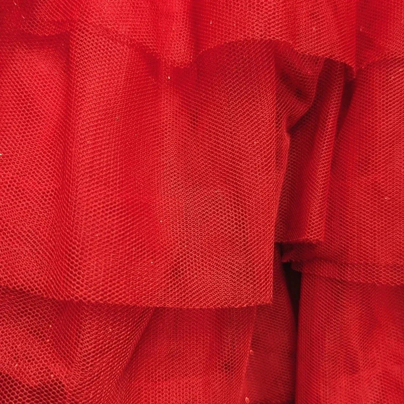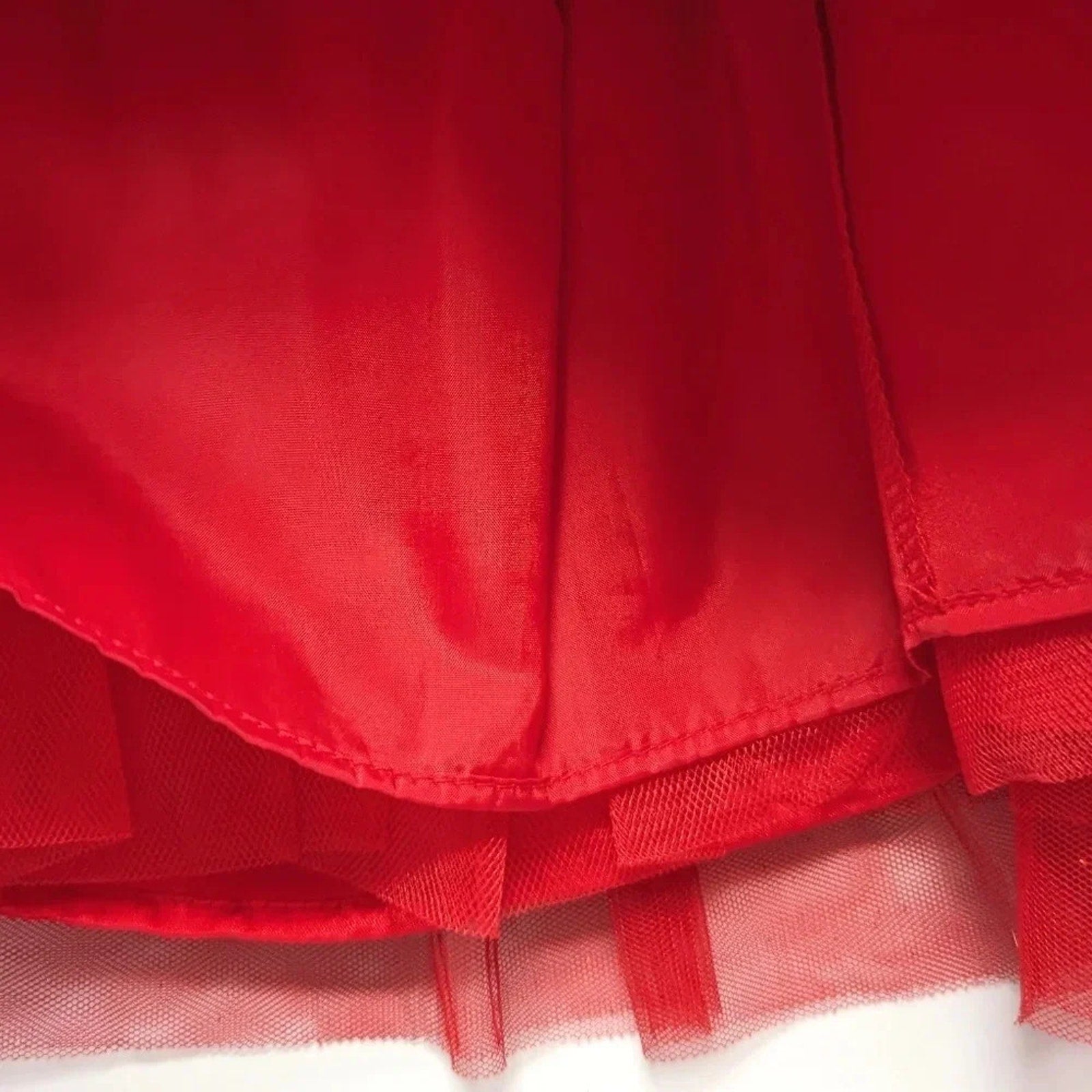 Classic Minnie design with a bright red satin skirt covered in white polka dots, a full twirl-worthy tiered tulle silhouette, and a black bow accent at the waist.