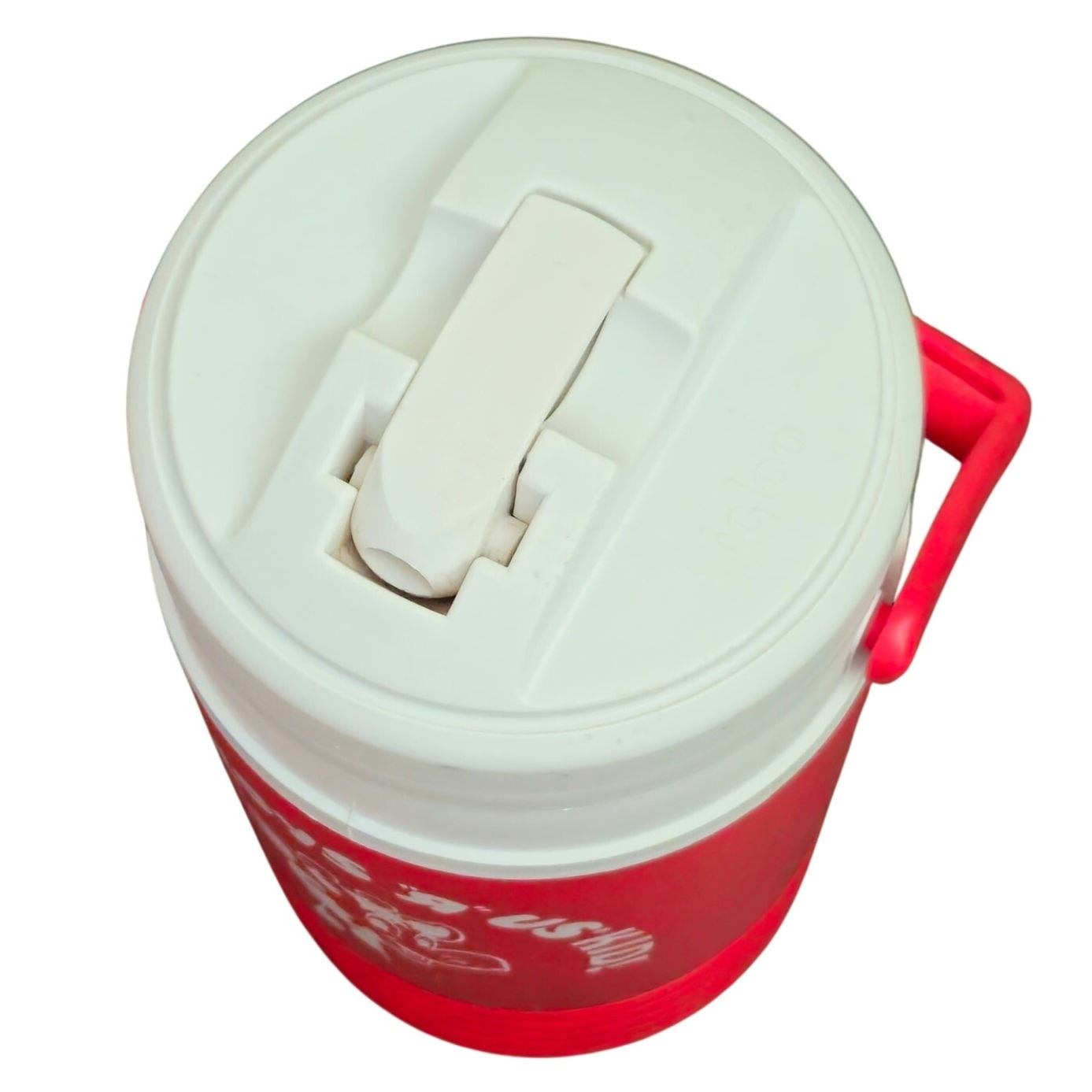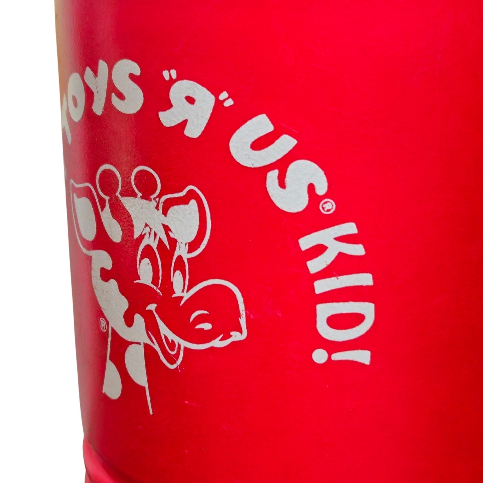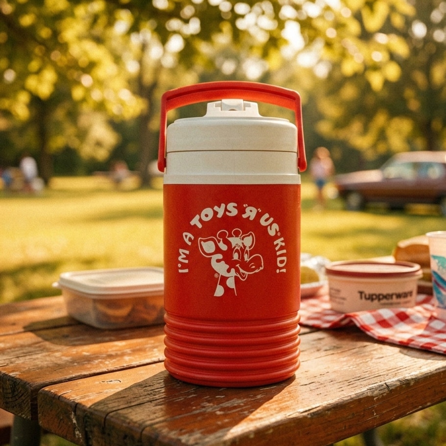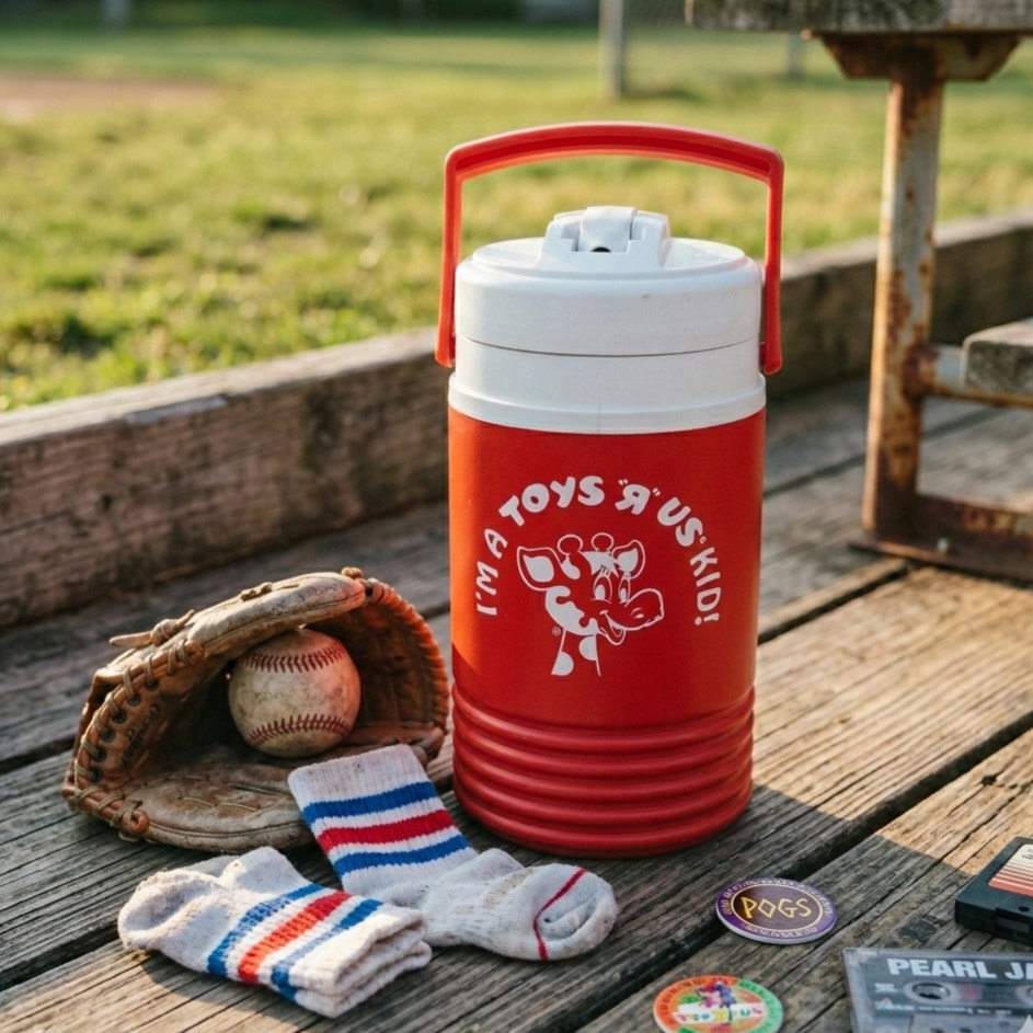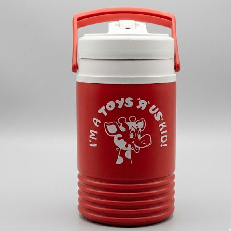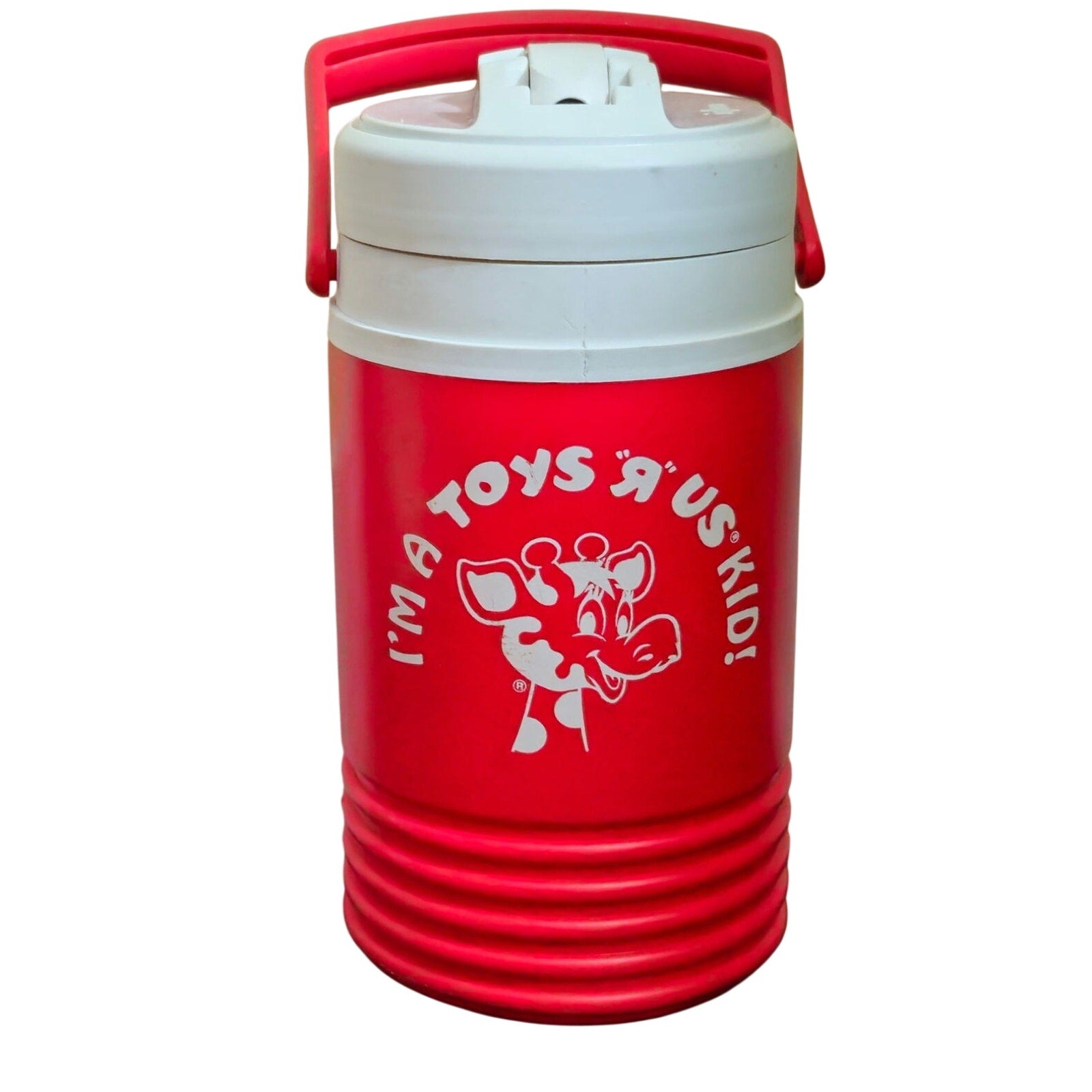 This vintage Igloo half-gallon drink jug features the iconic “I’m a Toys R Us Kid!” slogan with Geoffrey the Giraffe front and center. Bright red body, white lid, classic swing handle — the exact kind of cooler that showed up at little league games, summer camps, and 90s road trips.