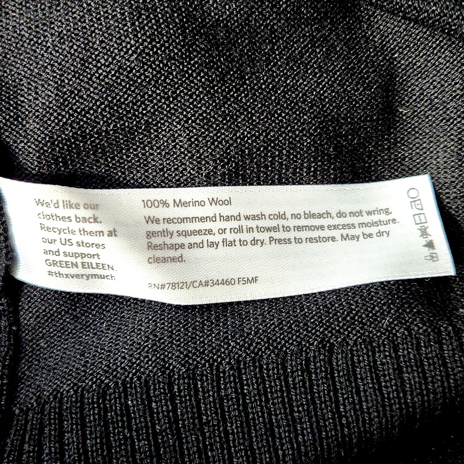 Eileen Fisher sweater, merino wool tunic, minimalist black sweater, Italian yarn knit, sustainable fashion, luxury basics, relaxed fit pullover, cozy wool top, modern capsule wardrobe, timeless essential, ethical clothing