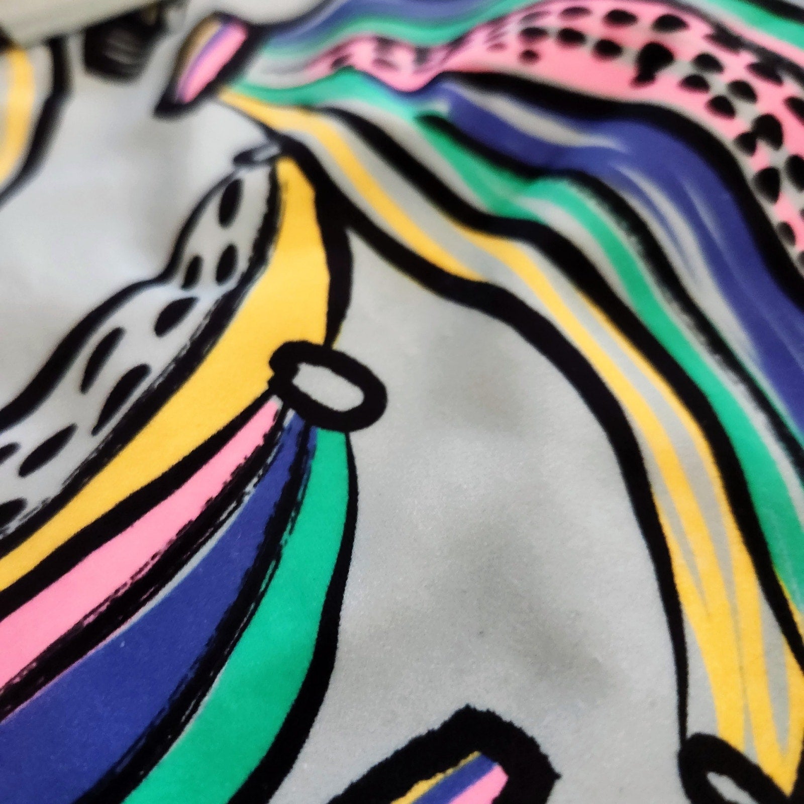Make a splash in style! This girls’ two-piece swimsuit features a fun, vibrant banana print in pastel shades of pink, purple, blue, yellow, and green on a light aqua background. The set includes: