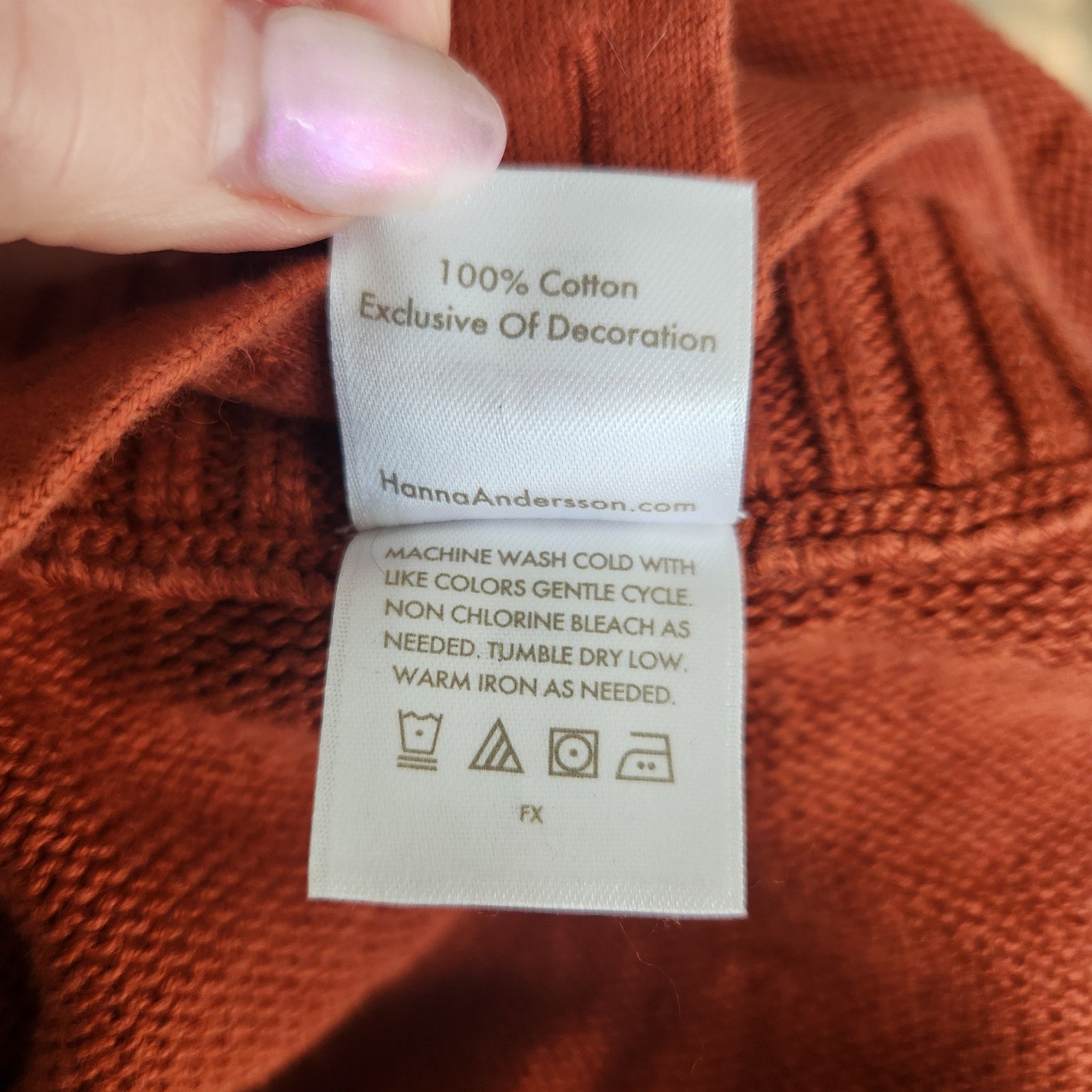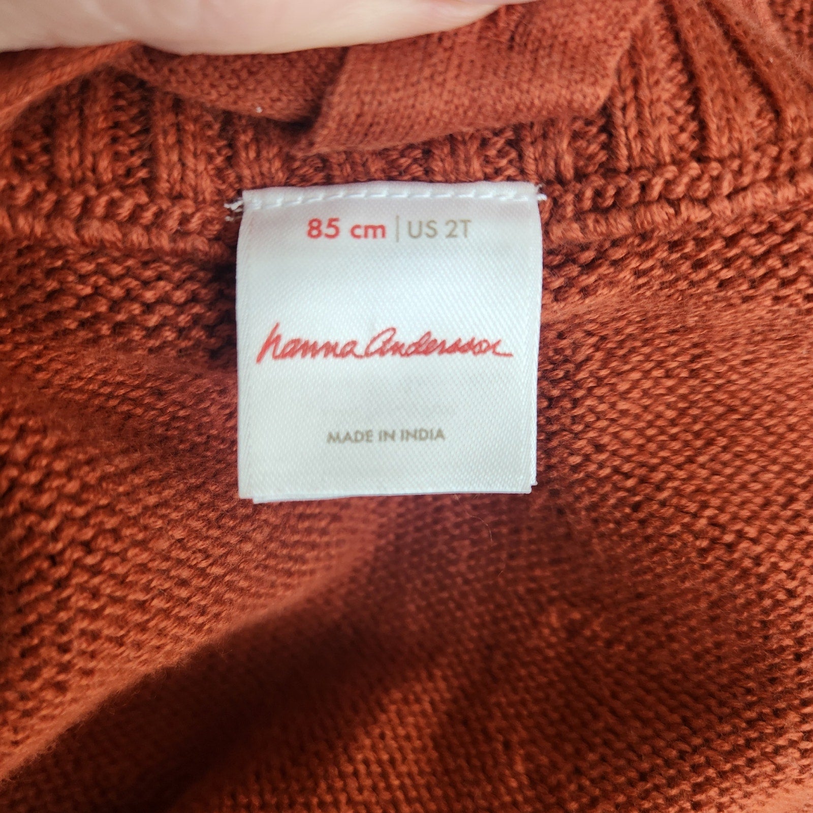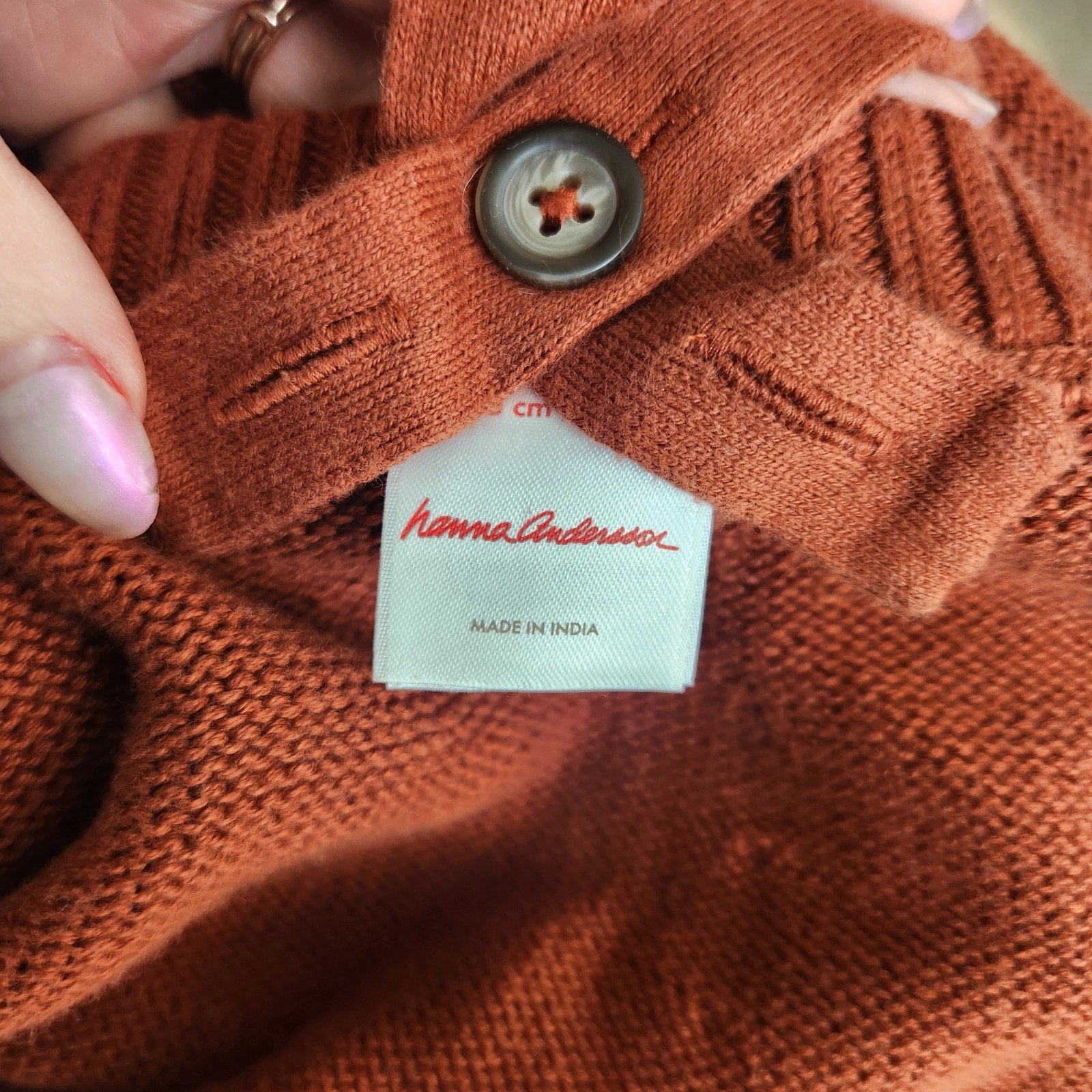 Adorable and cozy, this rust-colored Hanna Andersson knit jumper dress features a playful bear face with tiny knit ears on the bib front — perfect for fall and winter layering. Crafted from soft 100% cotton, it offers comfort and warmth with a touch of Scandinavian charm.