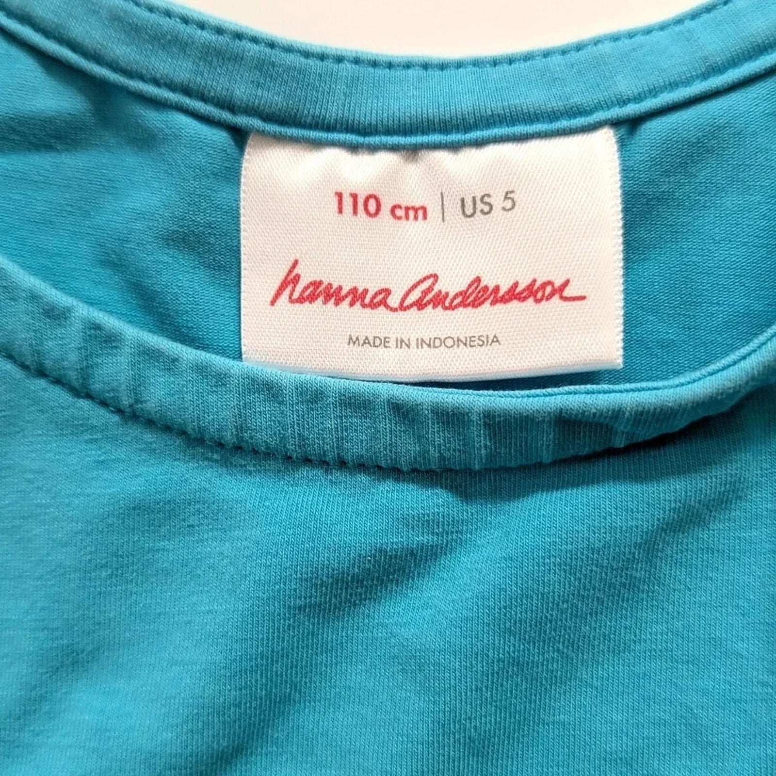 Hanna Andersson girls dress, Hanna Andersson ruffle play dress, turquoise blue kids dress, girls size 5 play dress, Hanna Andersson 110 cm, cotton jersey dress, eco-friendly kids clothing, OEKO-TEX certified dress, Hanna Andersson school dress, Hanna Andersson everyday playwear.