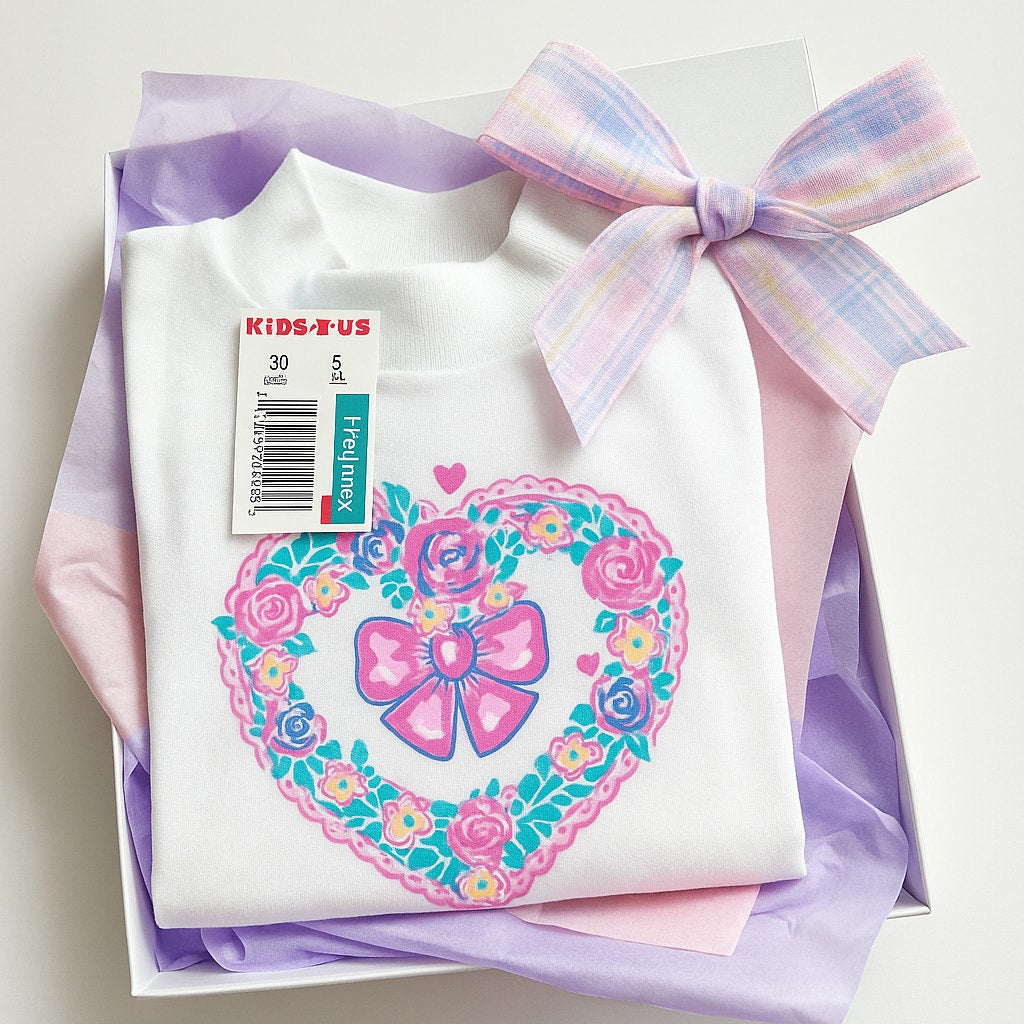 Healthtex Vintage 1980s Girls Mock Turtleneck Shirt – White Long Sleeve, Heart Wreath Bow Print, Retro Toys R Us – Size 5 – Made in USA NWT