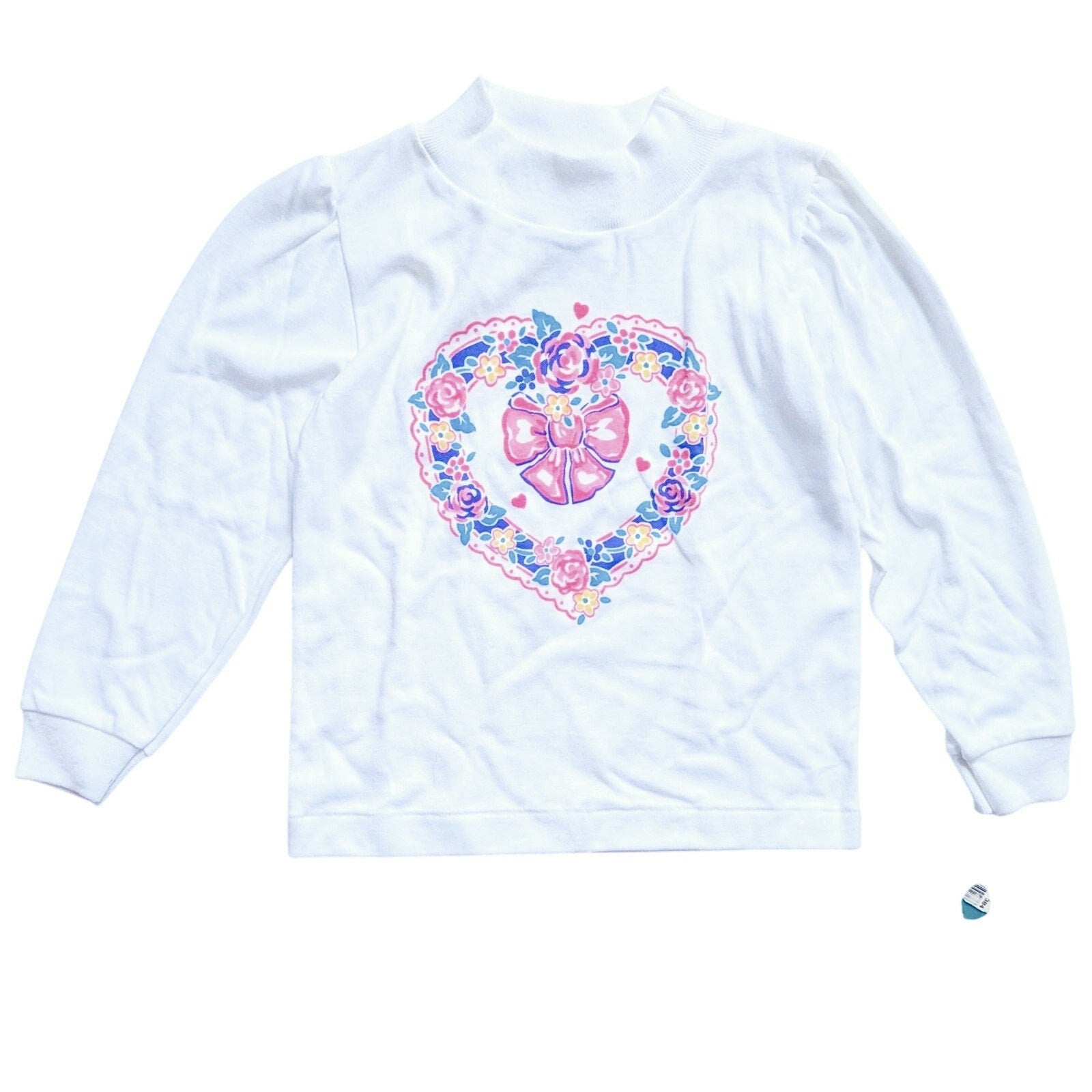 Step back into the colorful 1980s with this vintage Healthtex girls’ long sleeve shirt – new with tags and originally sold at Toys R Us. This rare find features a mock turtleneck design in crisp white with a playful pink, teal, purple, and yellow floral heart wreath print with a bow at the center.