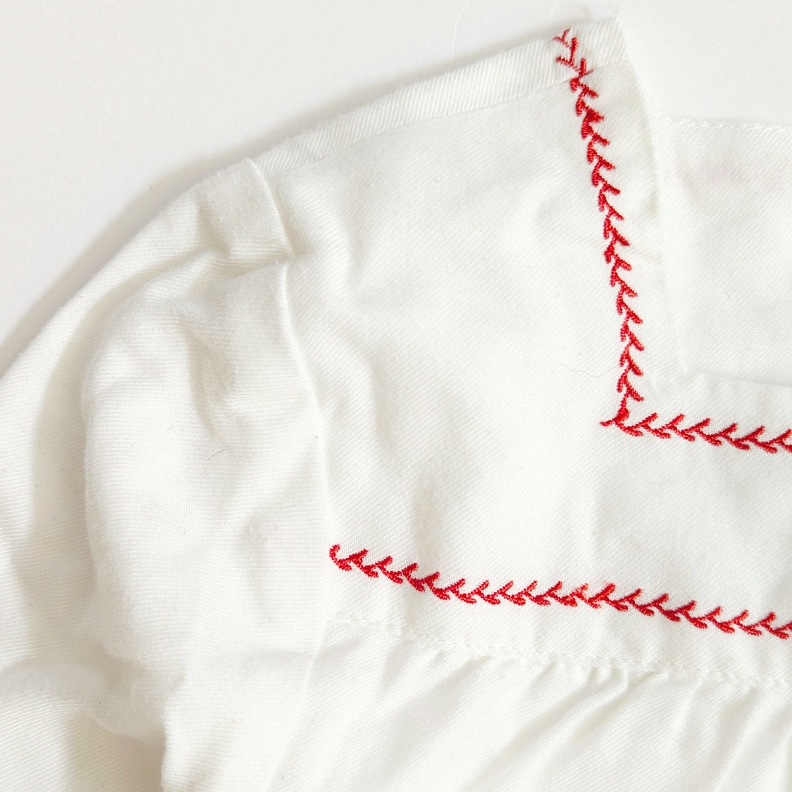 Color: White with red vine embroidery trim