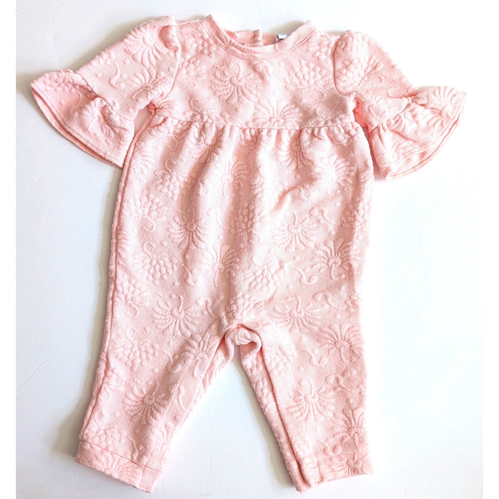 This adorable Janie and Jack baby girl one-piece romper is the perfect blend of comfort and elegance. Designed in a soft quilted jacquard matelassé fabric with delicate bell sleeves and a sweet pale pink hue (Strawberry Cream), it’s a timeless piece for playdates, family gatherings, or holiday photos. The thoughtful details—like a back button closure, full leg snaps for easy diaper changes, and a little back pocket—make this romper as practical as it is stylish.