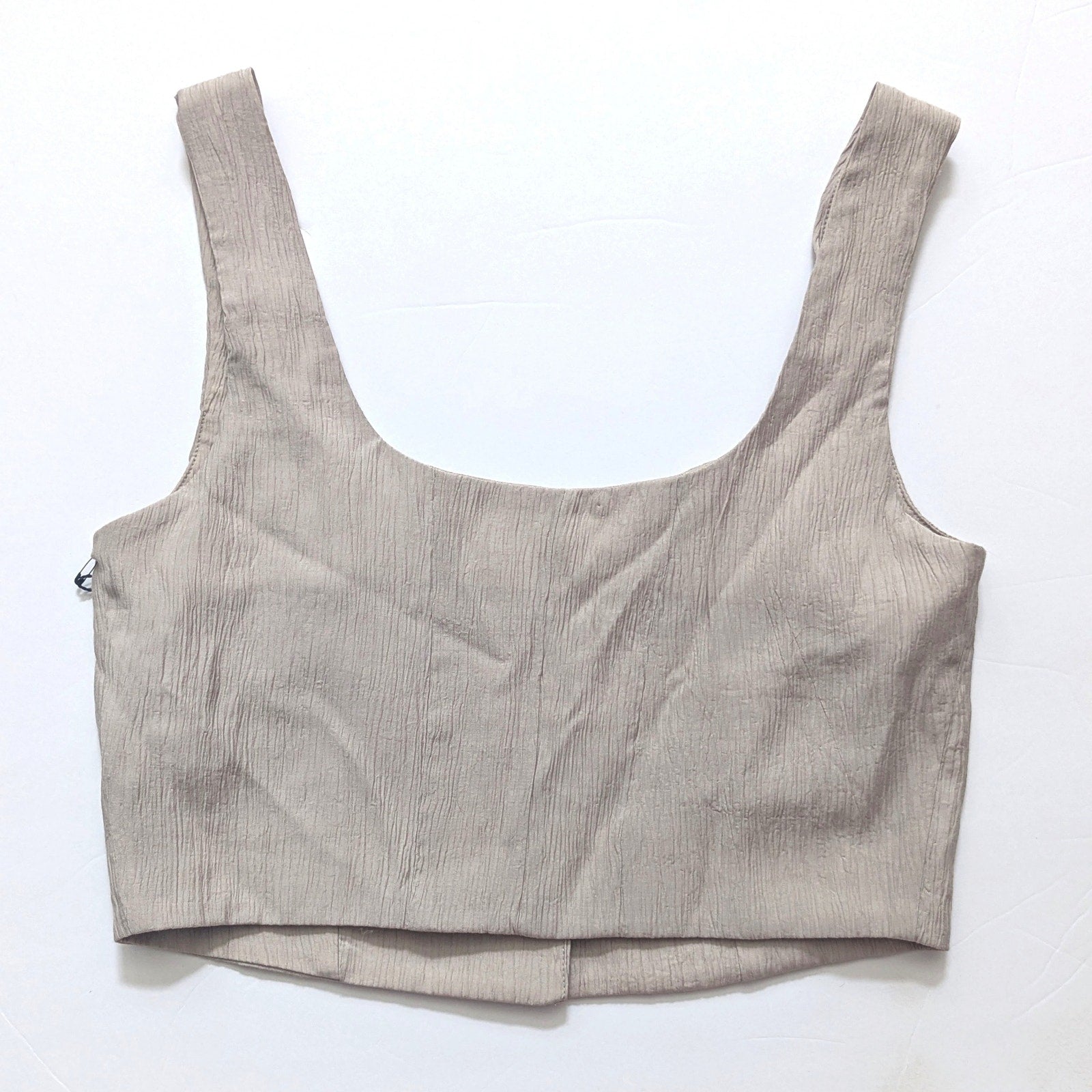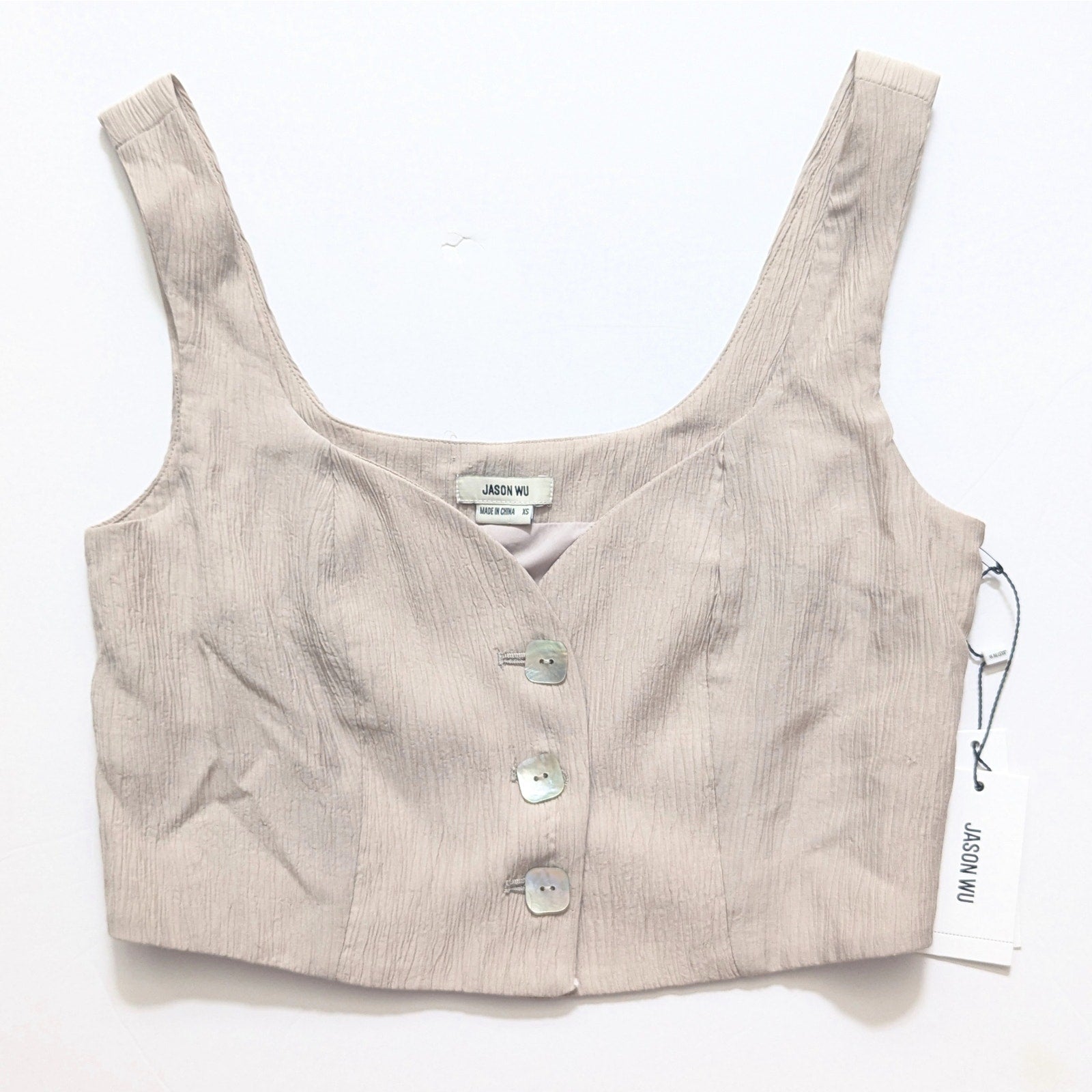 Tags: Jason Wu top, Jason Wu cropped top, beige crop top, taupe neutral top, designer summer top, chic minimalist blouse, mother of pearl button top, sleeveless crepe top, luxury crop tank, Jason Wu XS