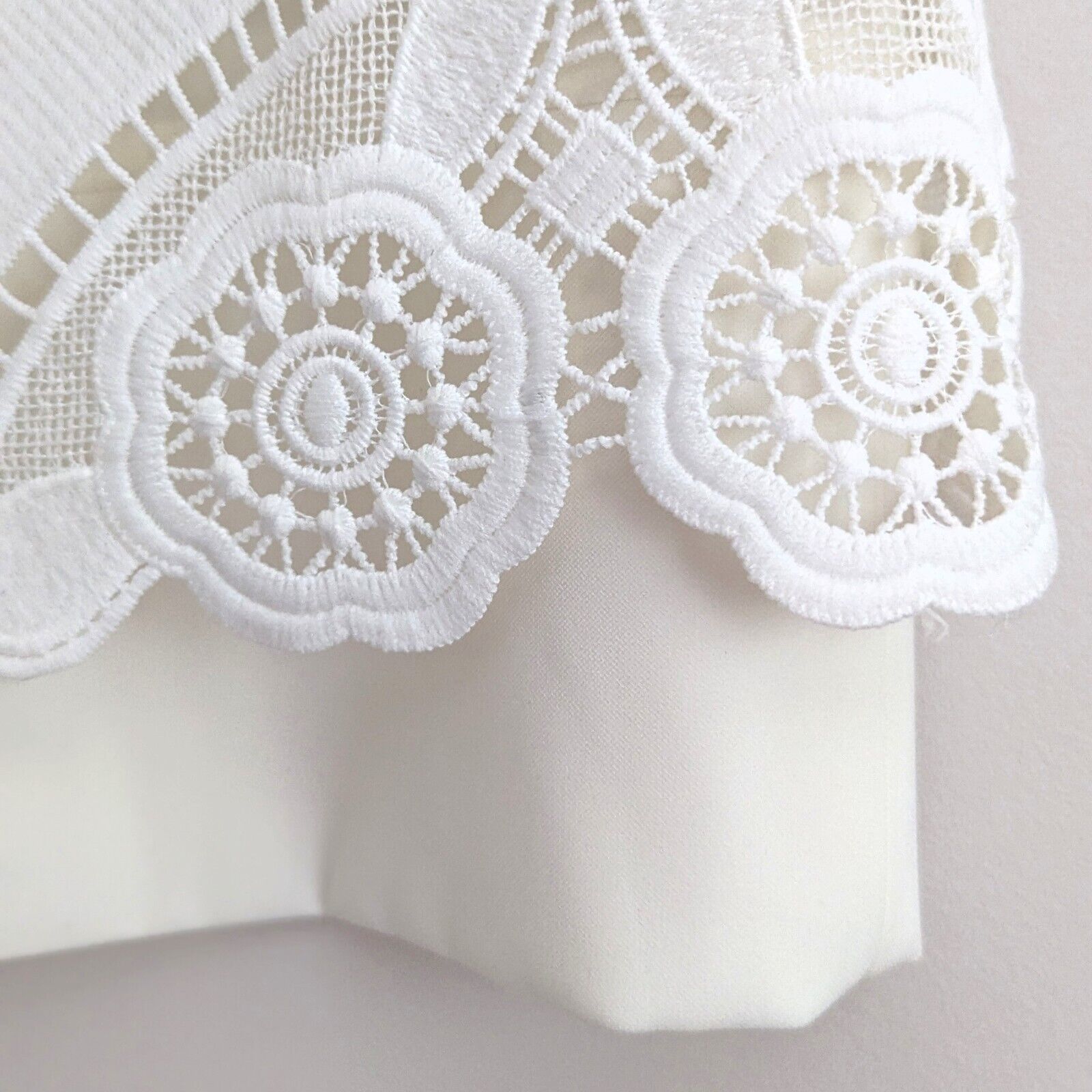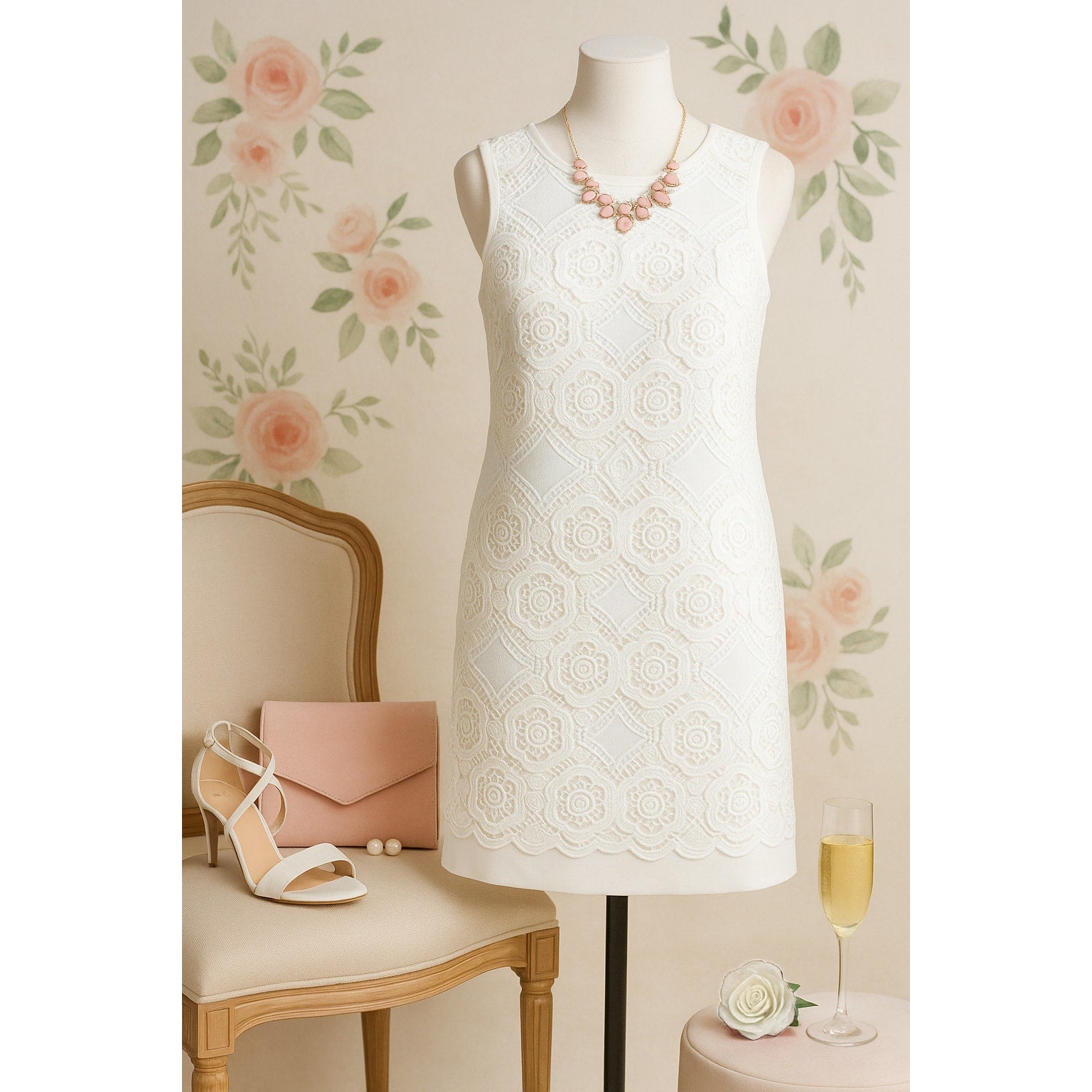 Features: Allover floral eyelet lace overlay, lined, hidden back zip