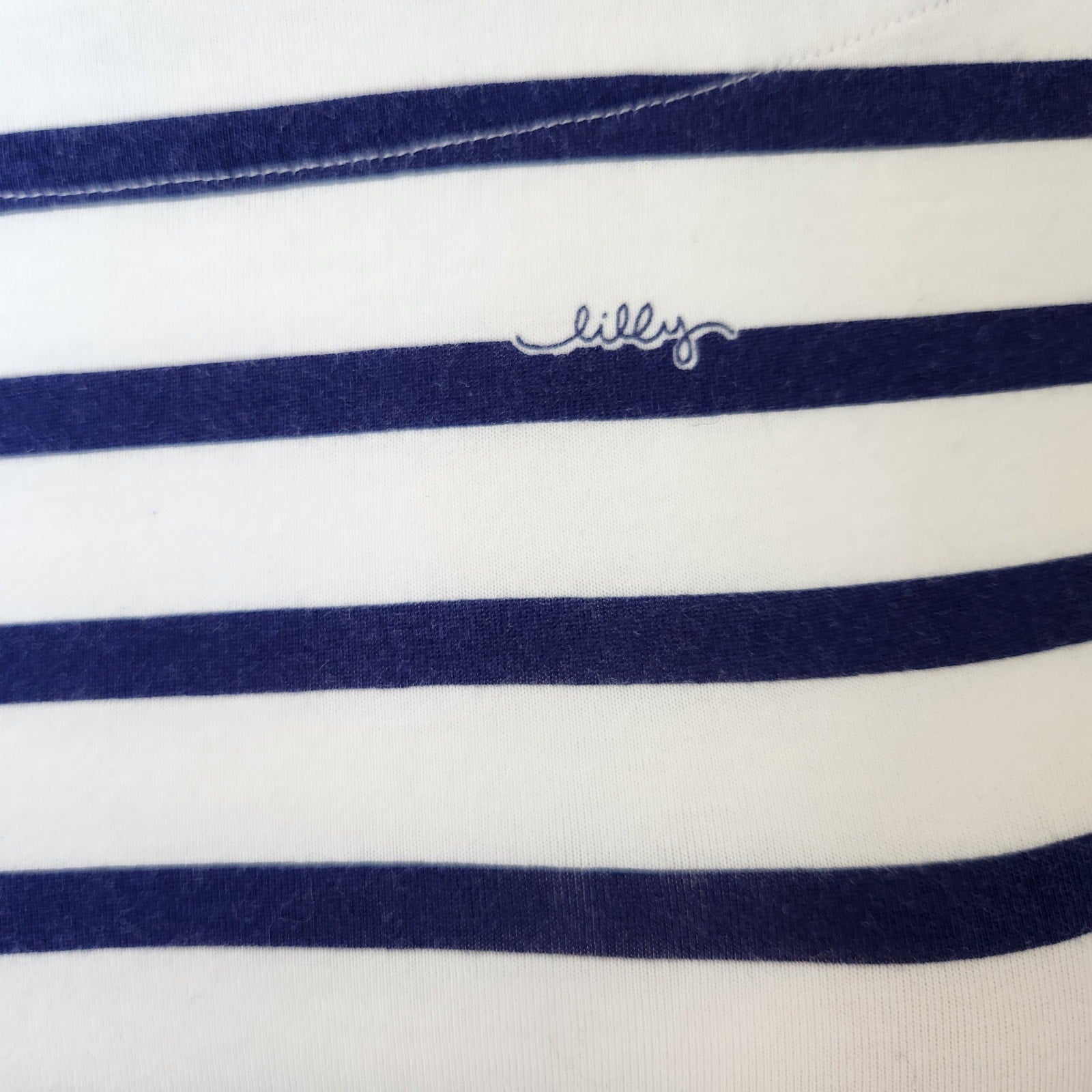 Channel coastal chic with this Lilly Pulitzer “Beacon Blue Serene Striped Peacock Engineered” Dress. Featuring nautical navy-and-white stripes with a stunning peacock-feather engineered border print at the hem, this classic shift silhouette is perfect for warm-weather days.