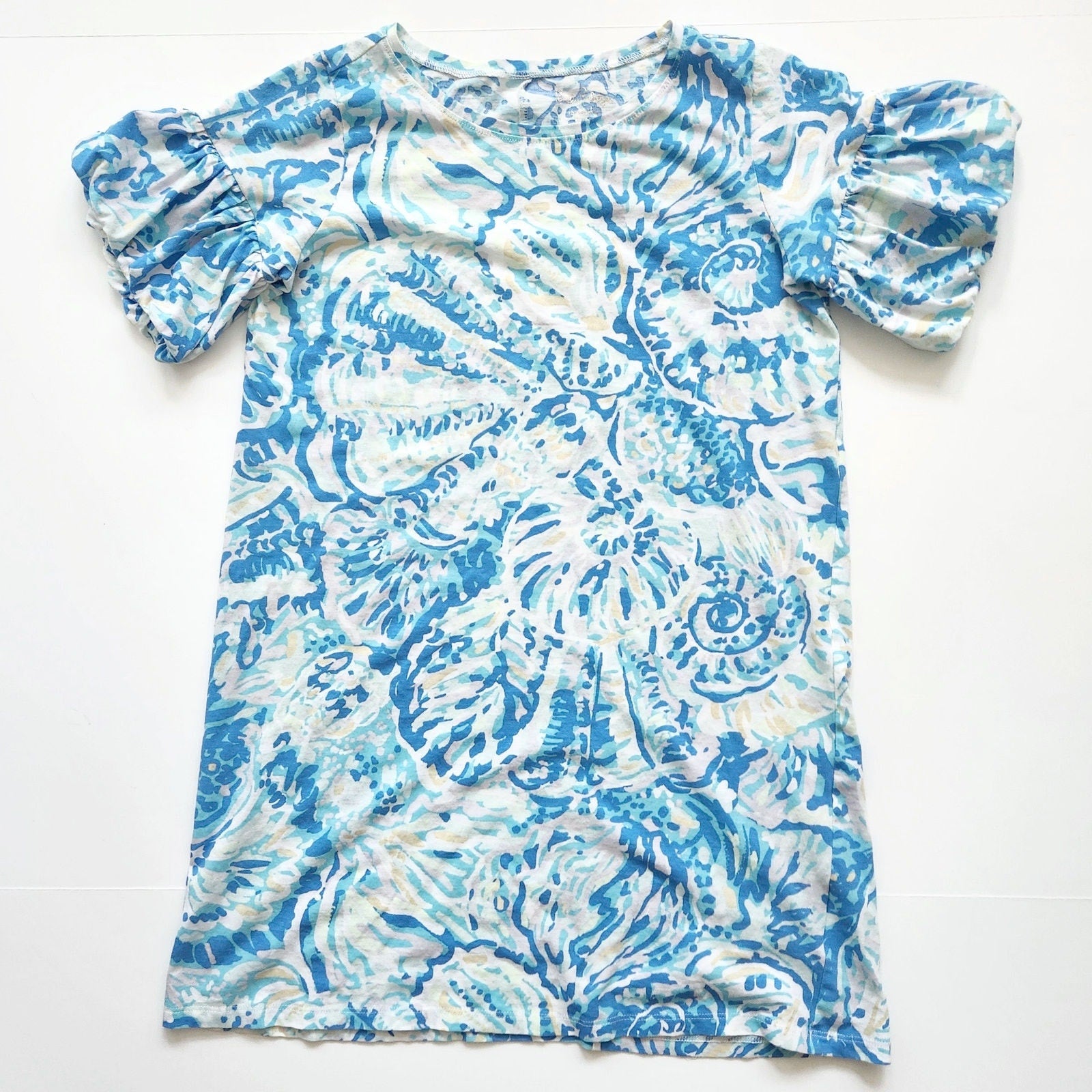 Lilly Pulitzer Girls Mini Linden Dress | XL 12-14 | Bennet Blue Shell Print Puff Sleeve Cotton