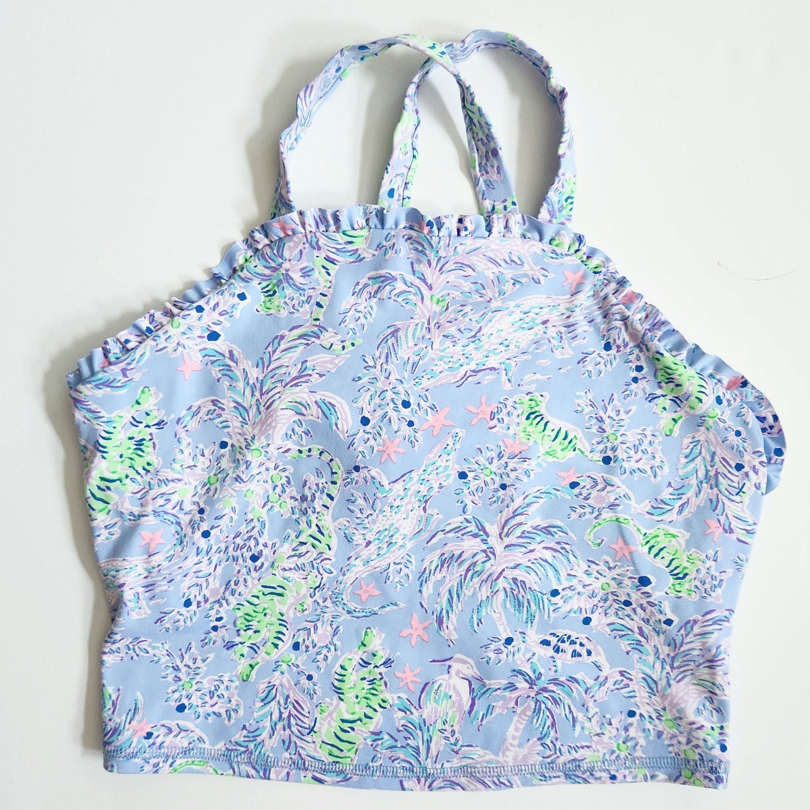 Stay chic, sporty, and sun-protected in this Lilly Pulitzer Luxletic Letitia Bra Tank in the playful “The Turtle Package” print. Designed in Blue Peri with tropical motifs—tigers, lizards, starfish, and palm trees in neon green, pink, and turquoise—this tank blends performance activewear with signature Lilly style.