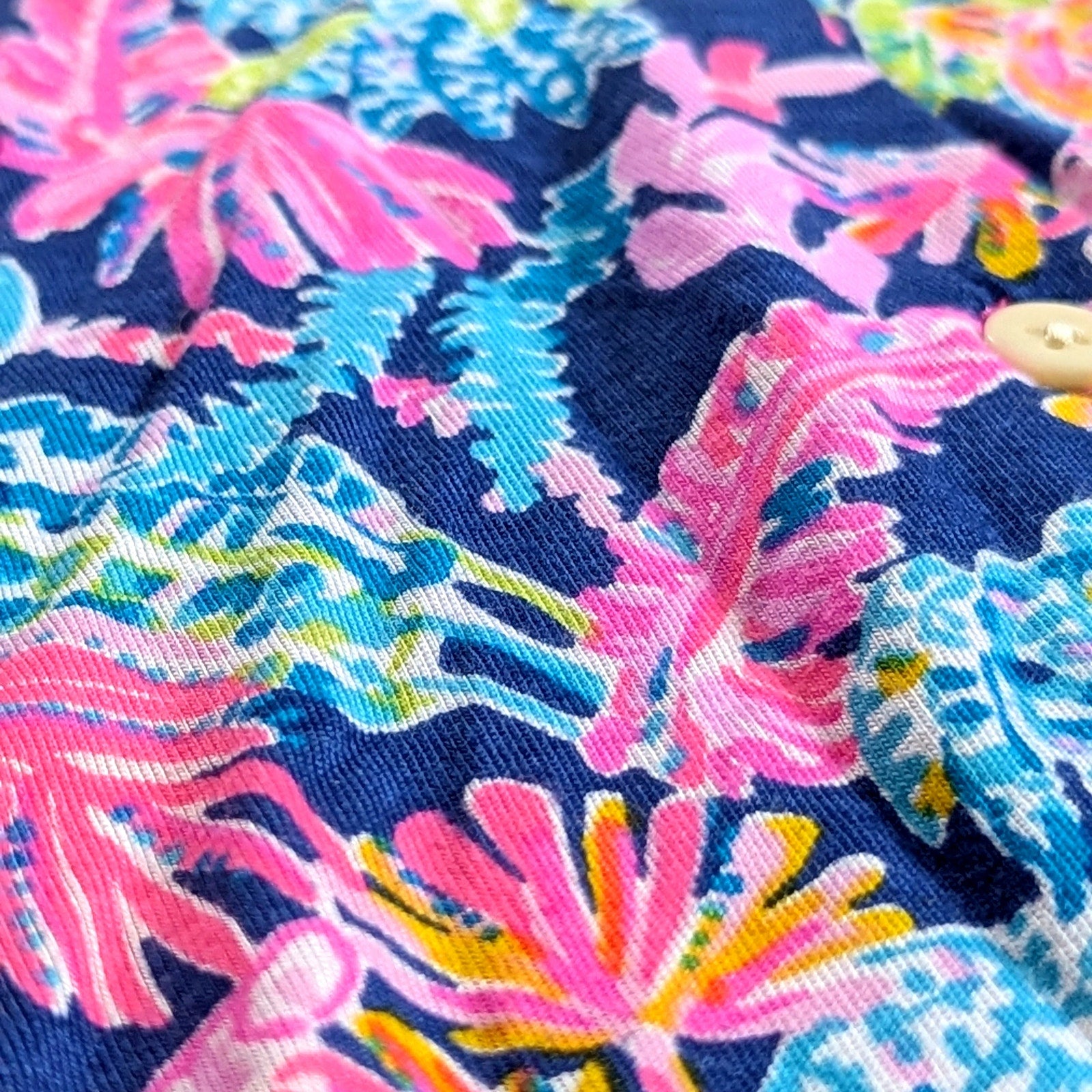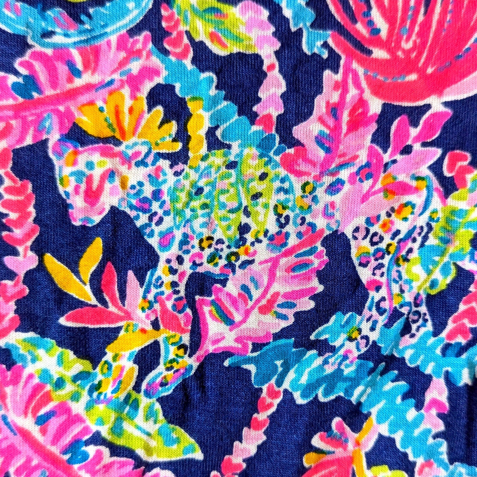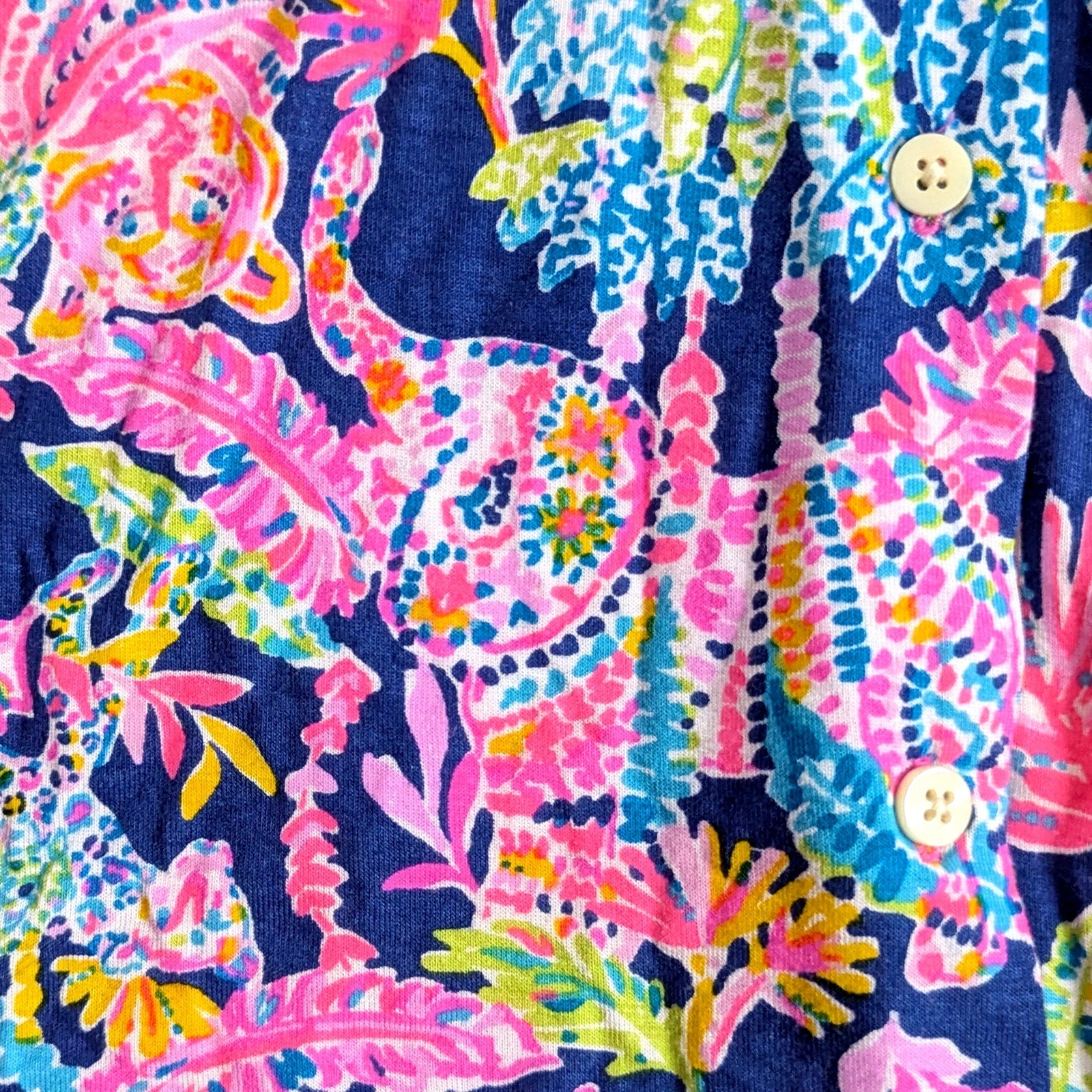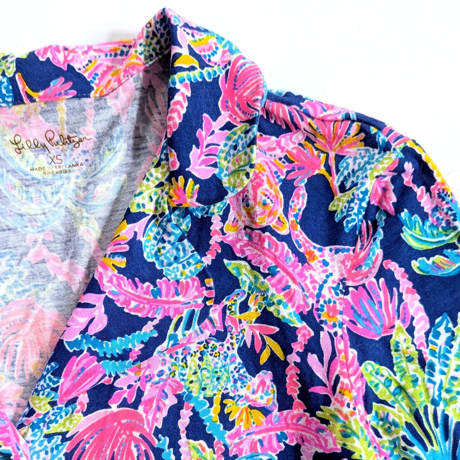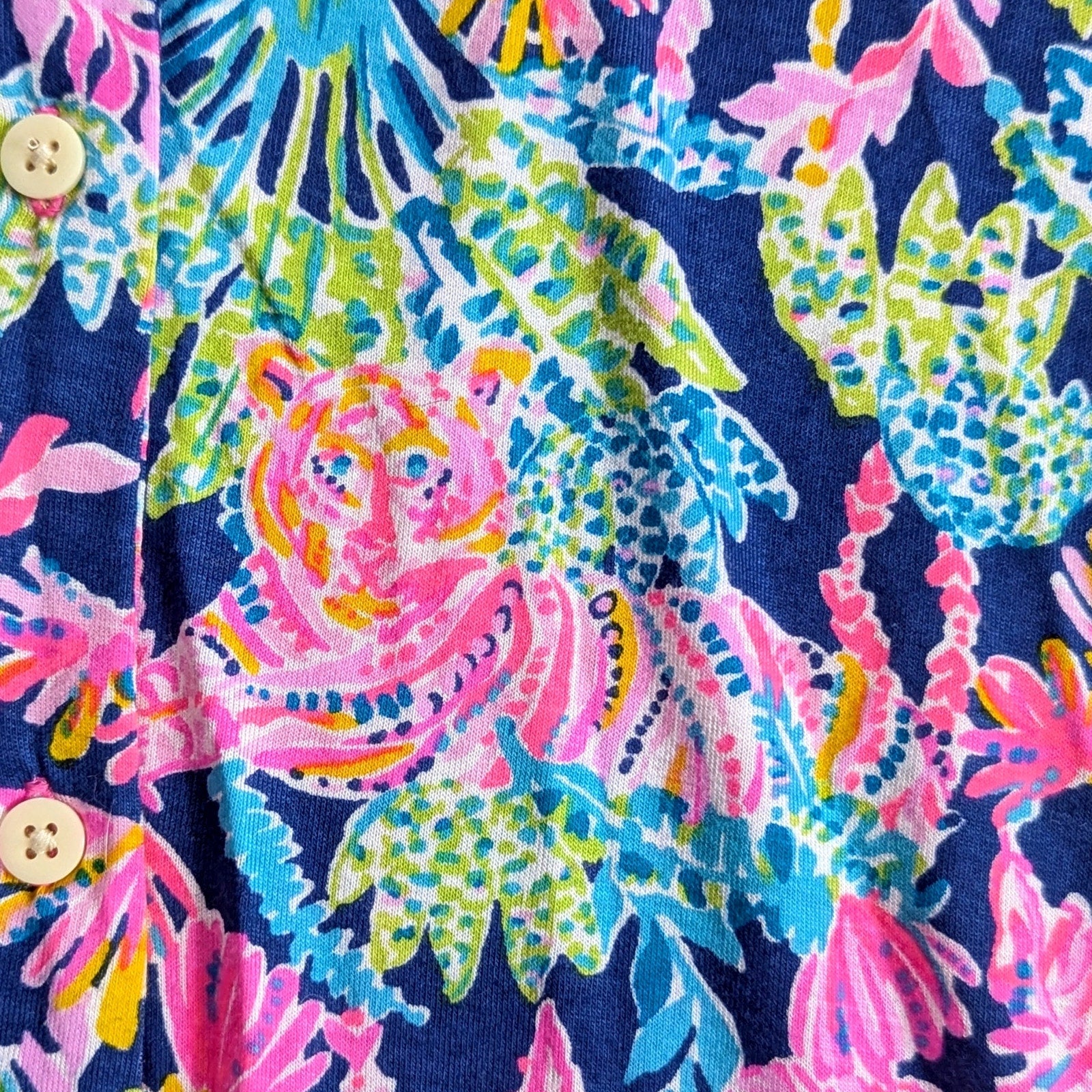 Lilly Pulitzer Seen & Herd, Cozy Cloud Jersey, Oyster Bay Navy, tropical print top, jungle animals, tiger print, resort wear, Palm Beach prep, colorful collared blouse, Lilly Pulitzer XS