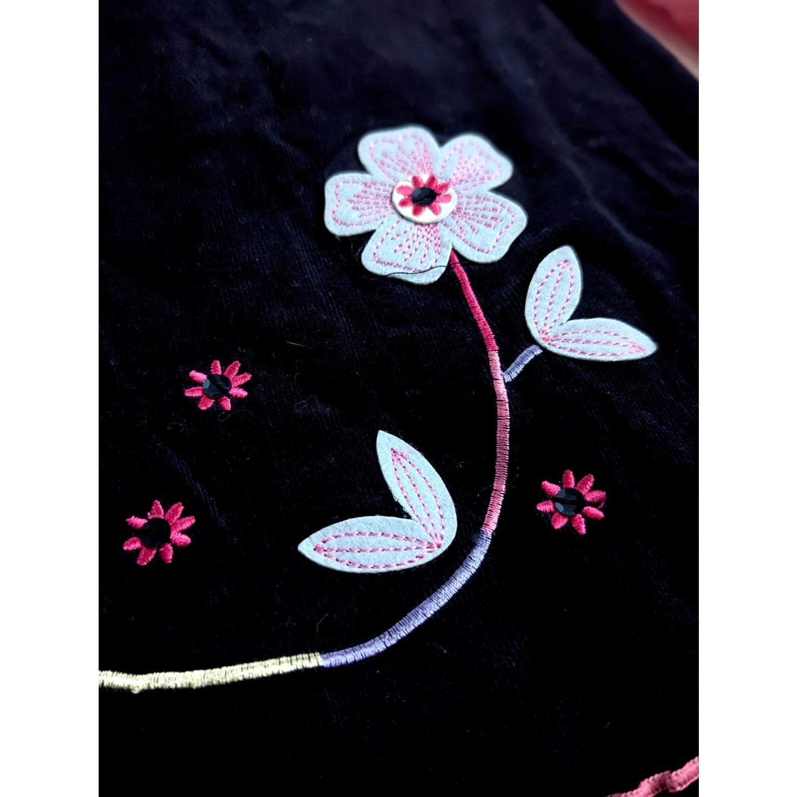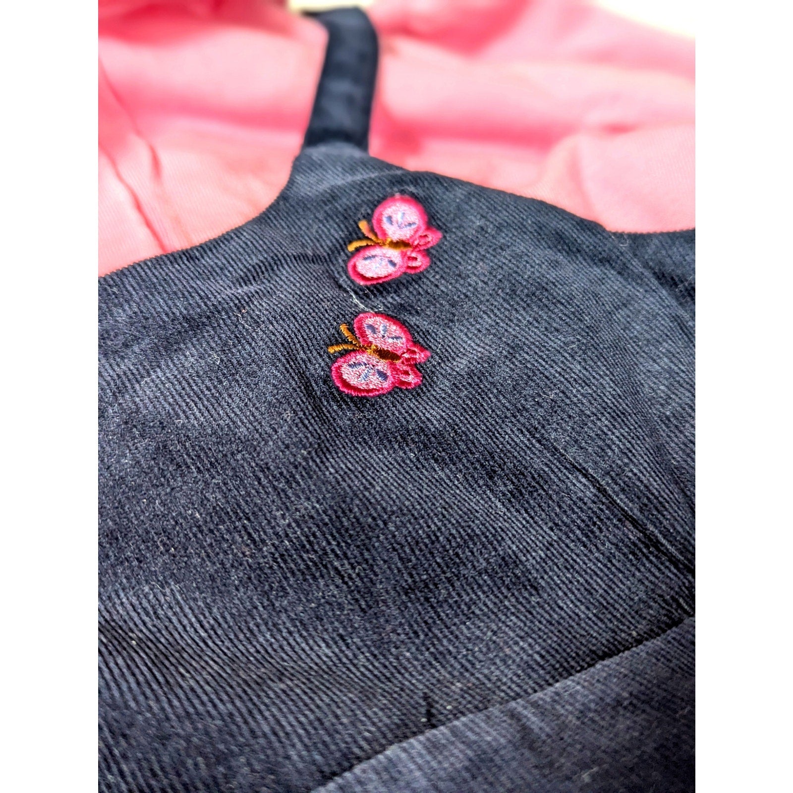 Navy blue corduroy jumper dress with sweet embroidered appliqués of butterflies and flowers in periwinkle and pink. Finished with a ruffle hem for extra charm.
