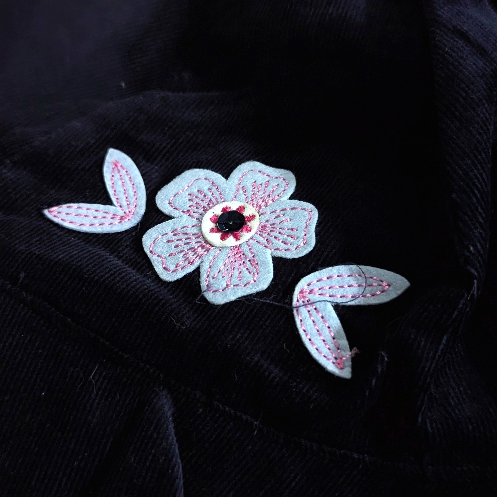 Coordinating corduroy bucket hat with matching flower applique for a complete look.