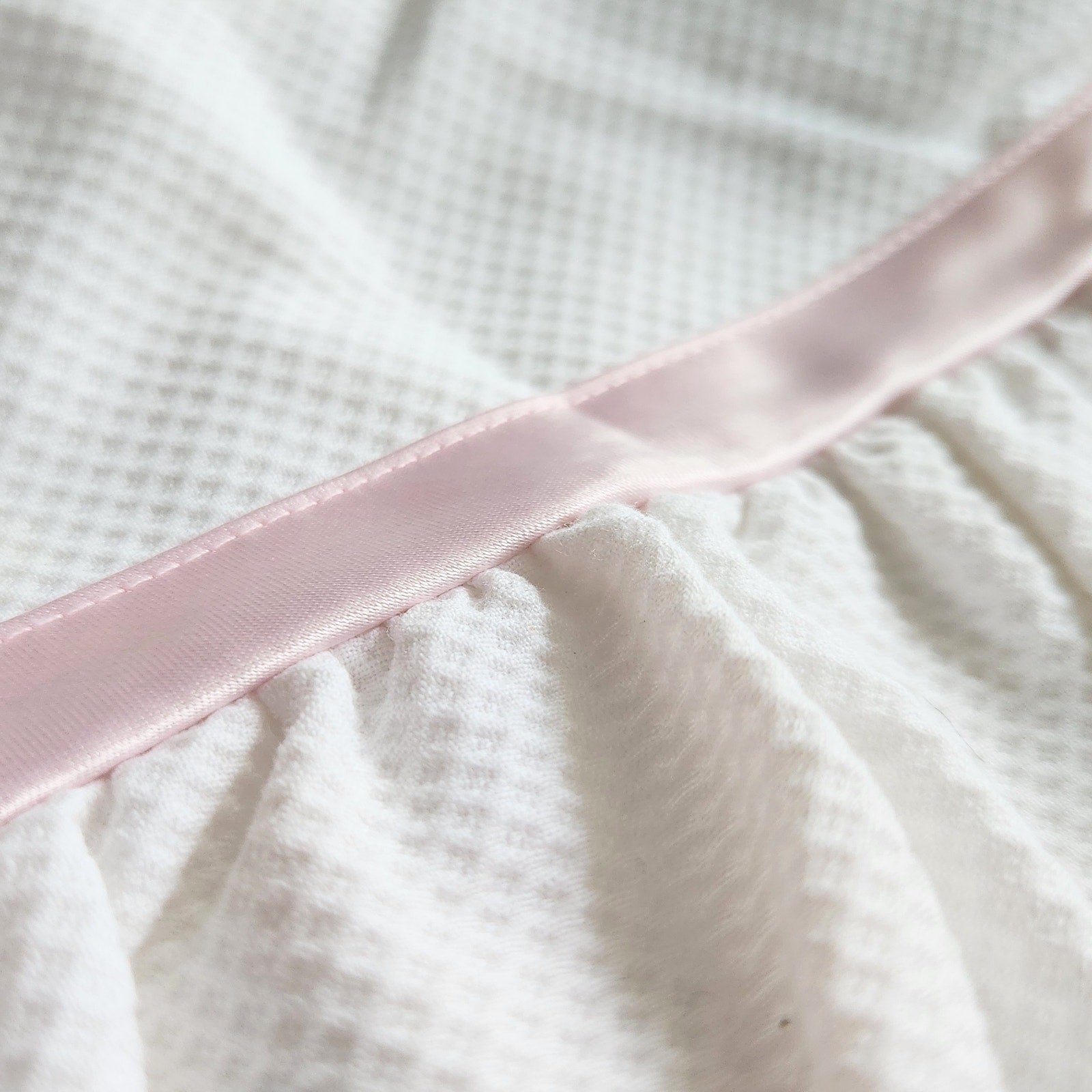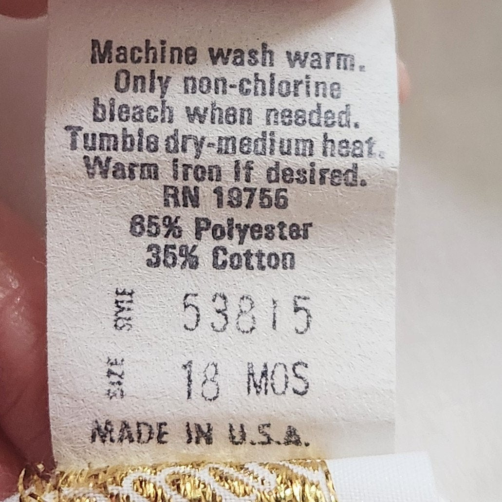 Bring timeless charm to your little one’s wardrobe with this authentic 1980s Little Bitty baby dress. Crafted in a soft poly-cotton waffle weave, this vintage piece is detailed with sweet pastel embroidery and applique. A white bear holding a yellow sailboat adorns the skirt, while a delicate satin pink ribbon and eyelet flutter sleeves complete the look. Perfect for keepsake photos, birthdays, Easter, or everyday retro style.