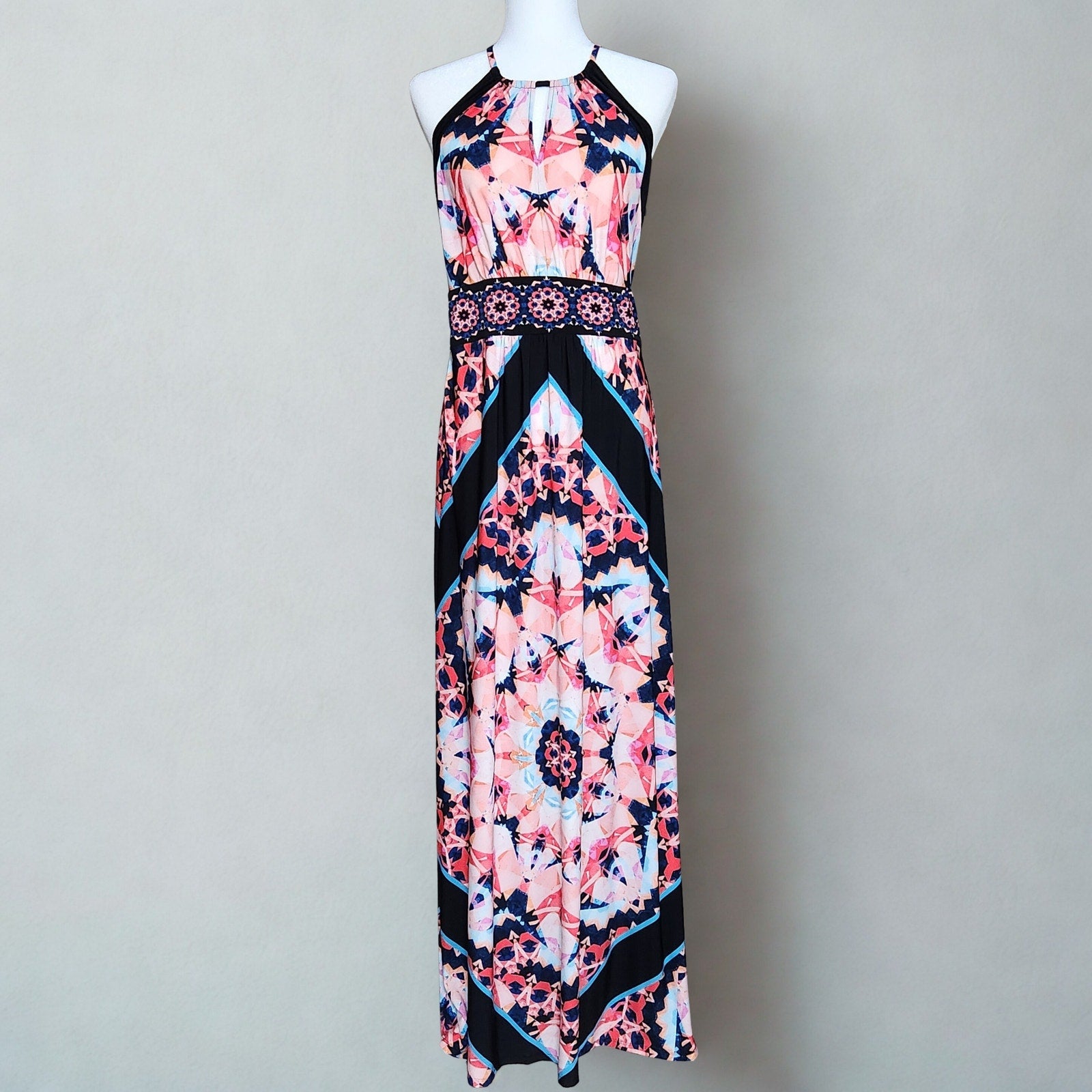 London Times Women's Halter Graphic Ikat Pink & Black Print Maxi Dress Size 10