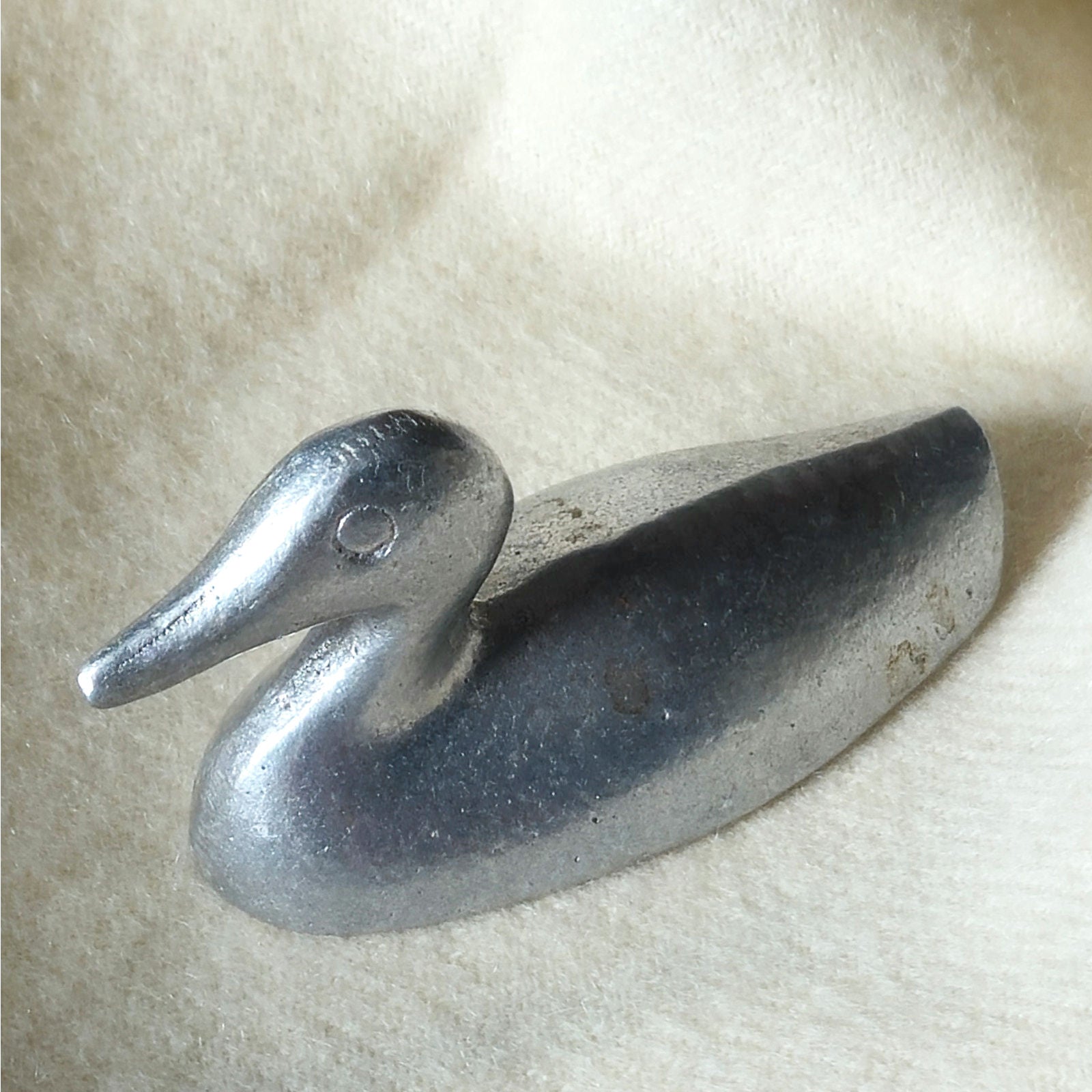Small in scale but strong in presence, this miniature waterfowl embodies the restrained elegance of postwar modern design. The smooth, simplified form and natural silver patina give it a quiet architectural quality — more sculptural object than novelty figurine.
