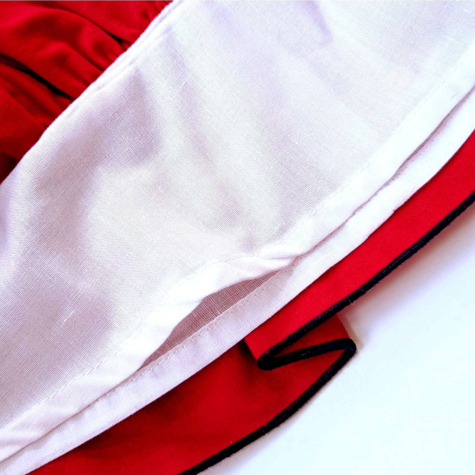 Rounded Peter Pan collar with delicate white ruffle trim