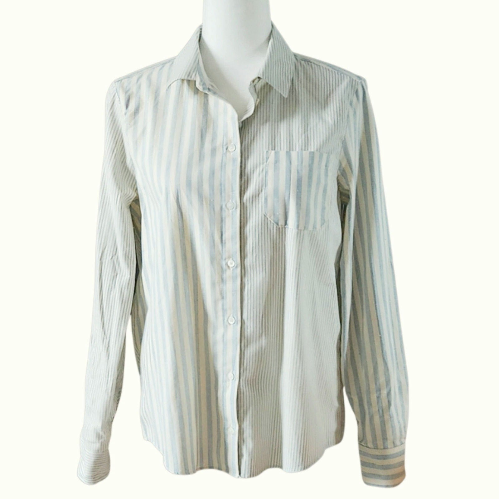 Its soft blue and cream contrasting stripes add subtle visual interest, while the relaxed cut makes it easy to dress up or down. Tuck it into jeans for a laid-back weekend look, or pair it with tailored trousers and loafers for polished workwear.