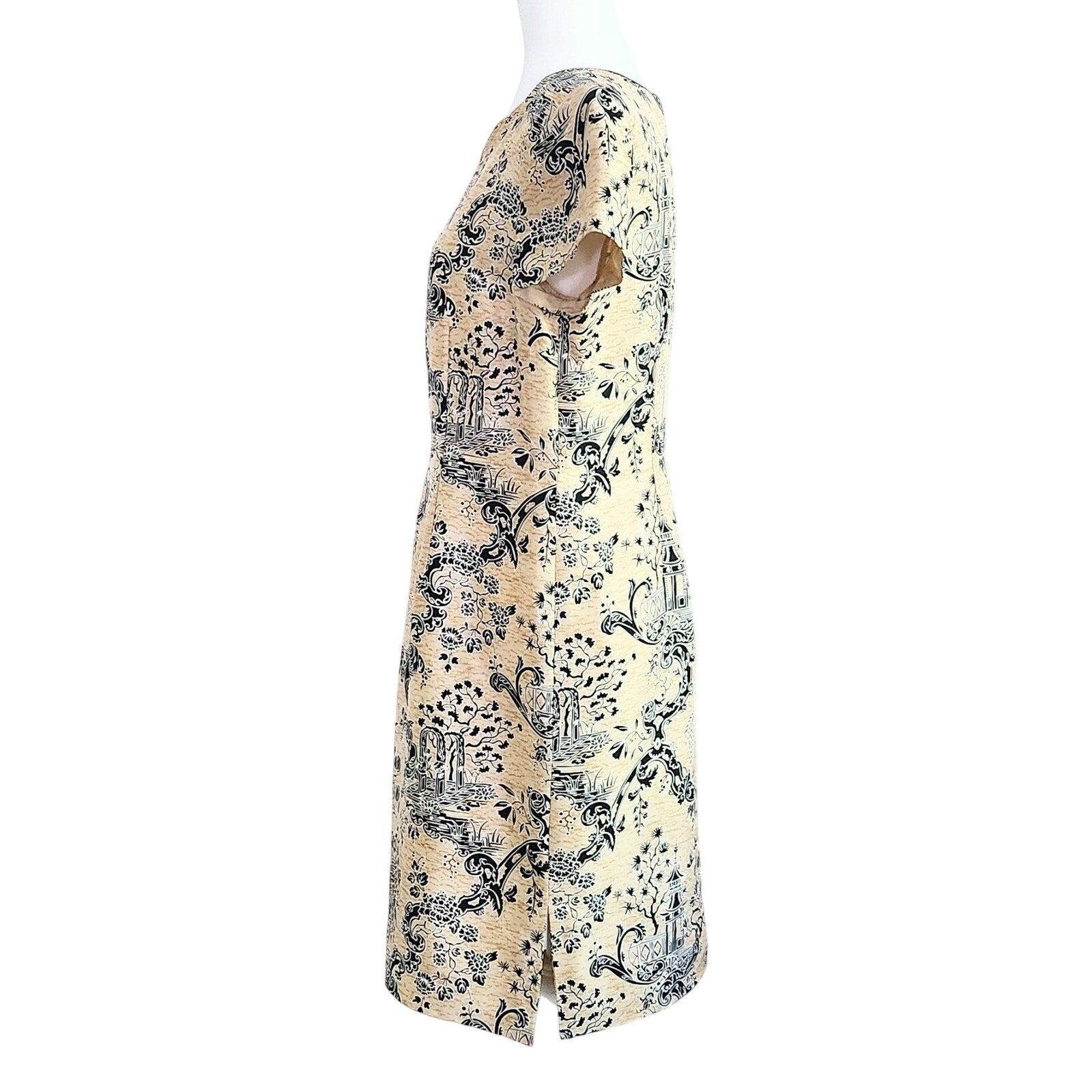Elevate your wardrobe with this stunning Talbots silk sheath dress featuring an intricate Asian-inspired black toile motif on a soft beige background. Crafted from 100% pure silk, this dress drapes beautifully with a sleek silhouette and feminine short sleeves.