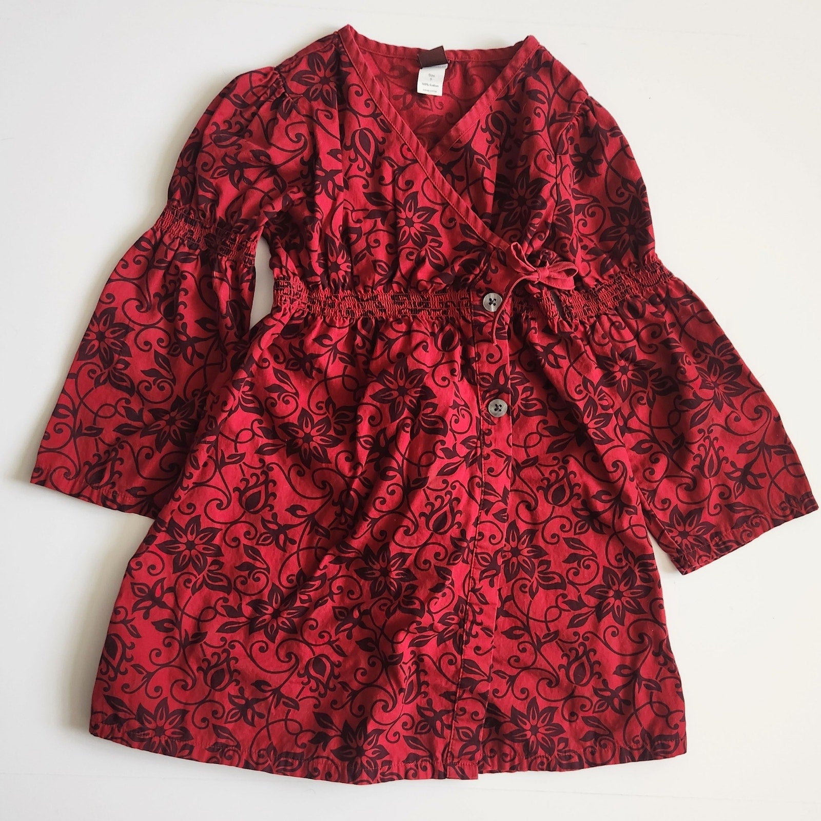 Red Floral Scroll Wrap Dress | Long Bell Sleeves | Girls Size 5