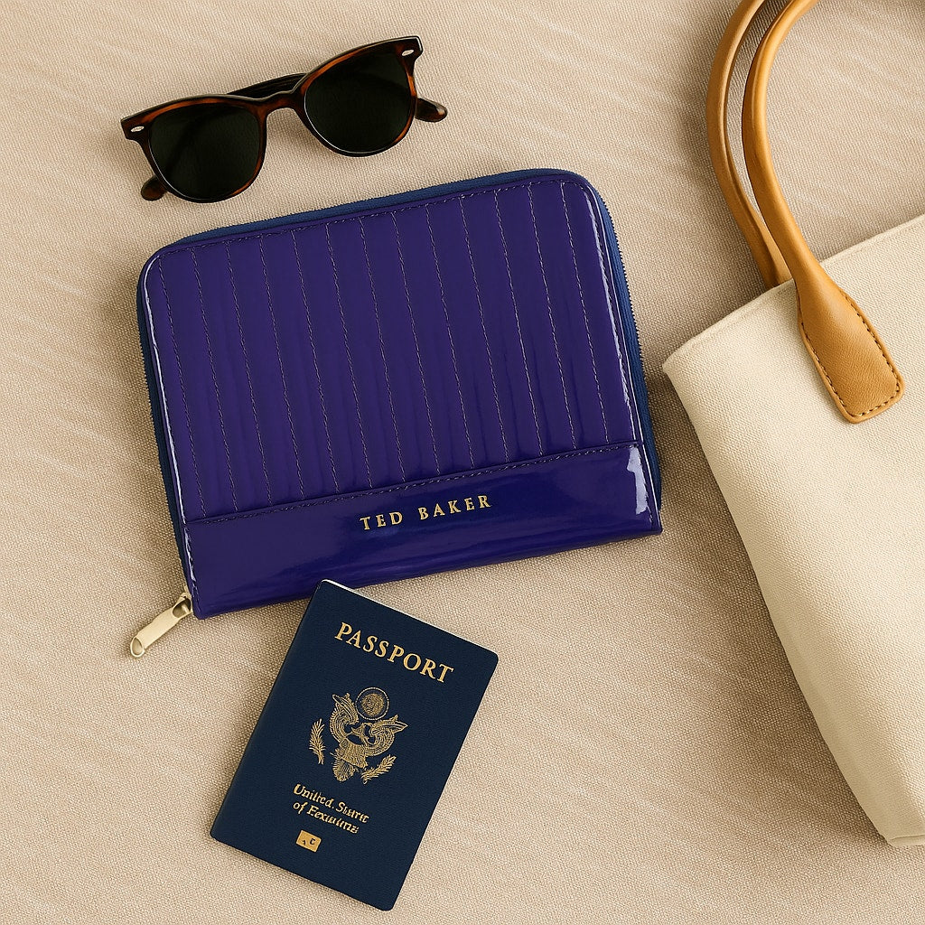 Tags: Ted Baker tech case, designer tablet case, purple patent leather, glossy clutch, quilted iPad case, statement portfolio, travel essentials, Y2K glossy patent, luxury work accessories, Poshmark Ted Baker