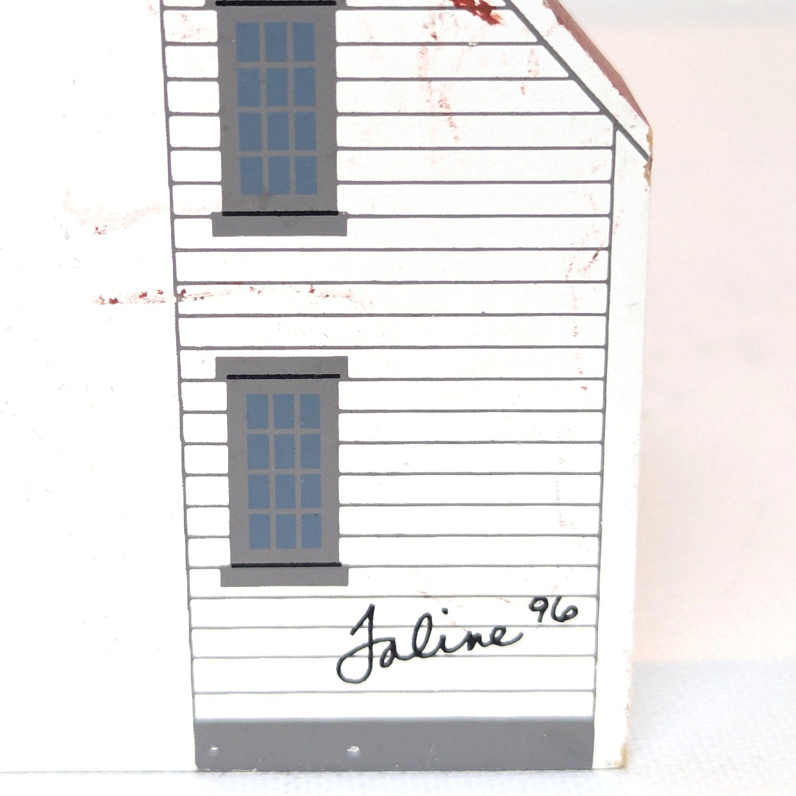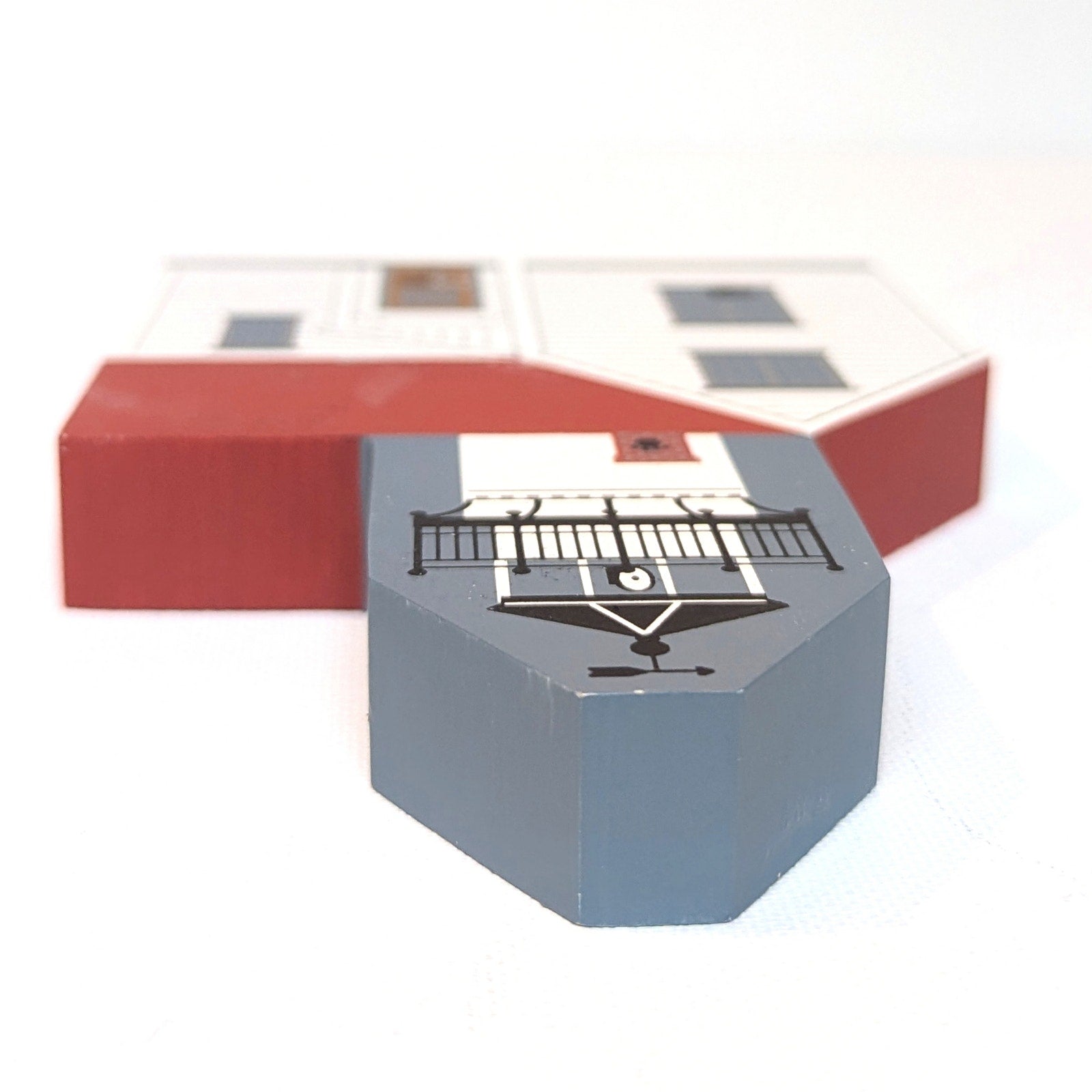 Bring coastal New England charm to your home with this 1996 Cat’s Meow “West Chop Lighthouse” from the Martha’s Vineyard Series. This hand-painted wooden collectible beautifully captures the character of the historic lighthouse, complete with red roof, blue tower, and the signature Cat’s Meow black cat in the window.