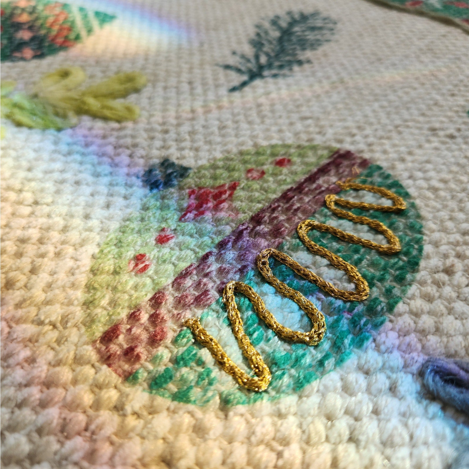 Features: Embroidered holiday ornaments with metallic thread details