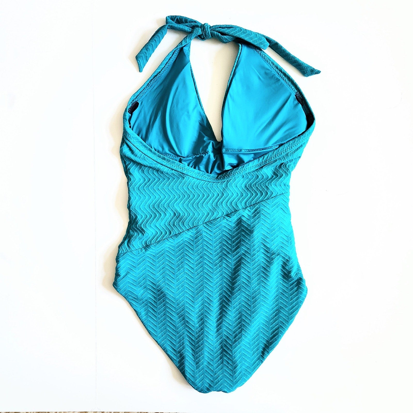 Trina Turk Women's Empire Halter One Piece Swimsuit Marine Teal Chevron Metallic Size 14 NWOT