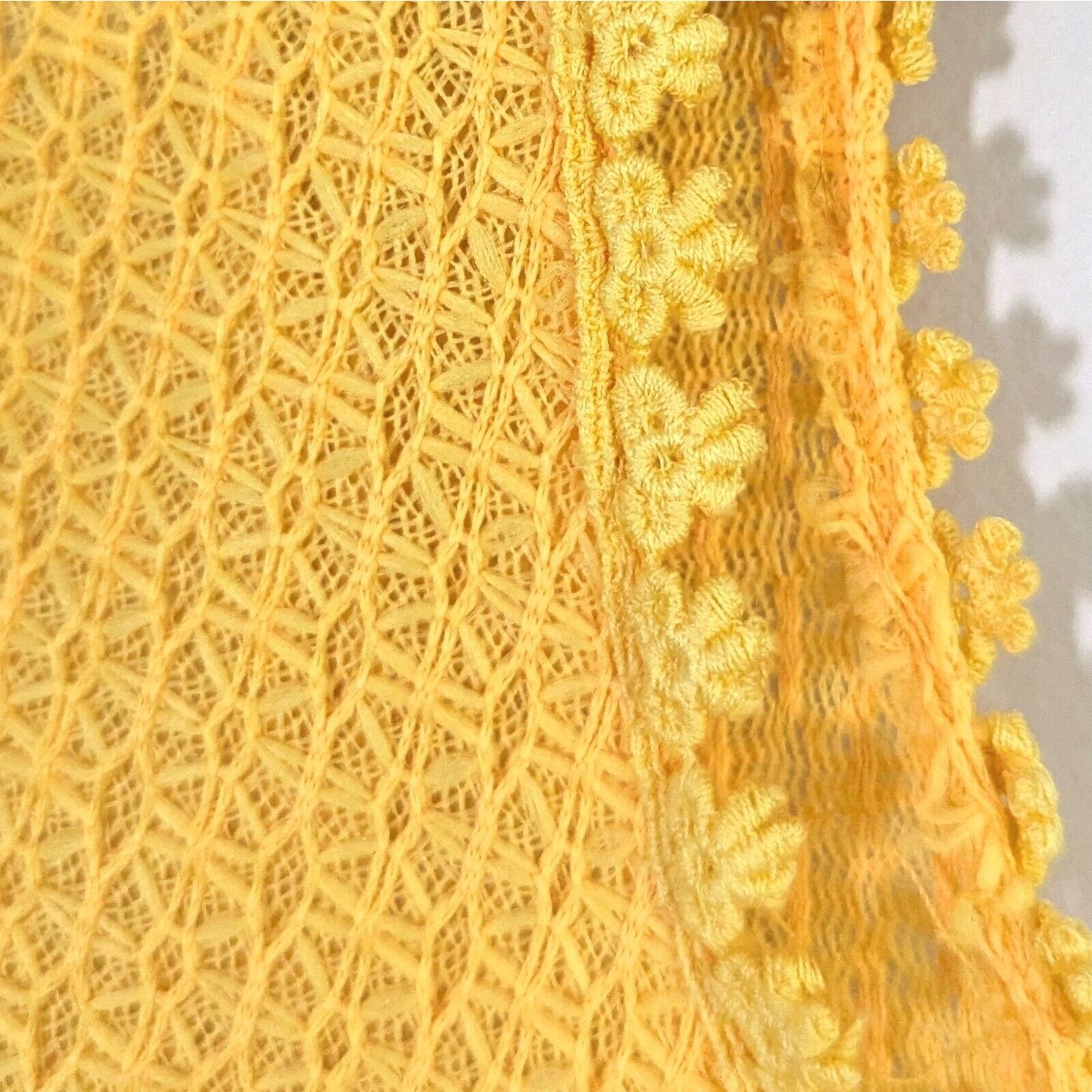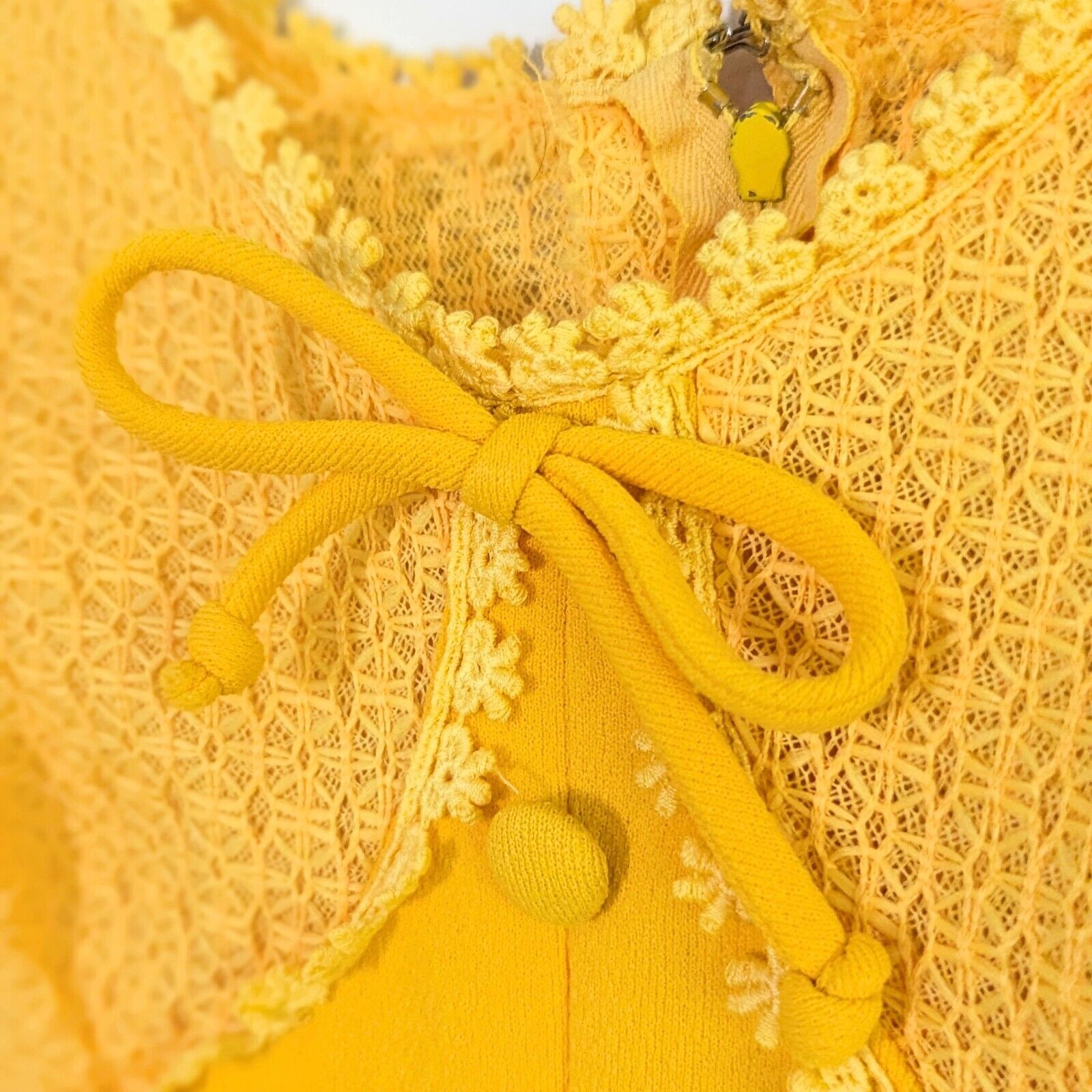 Step into retro sunshine with this gorgeous vintage 1960s maxi dress in vibrant marigold yellow. Featuring a lace overlay bodice with delicate daisy trim, sweet bow detail, and fabric-covered buttons down the front, this dress perfectly captures mid-century boho charm.